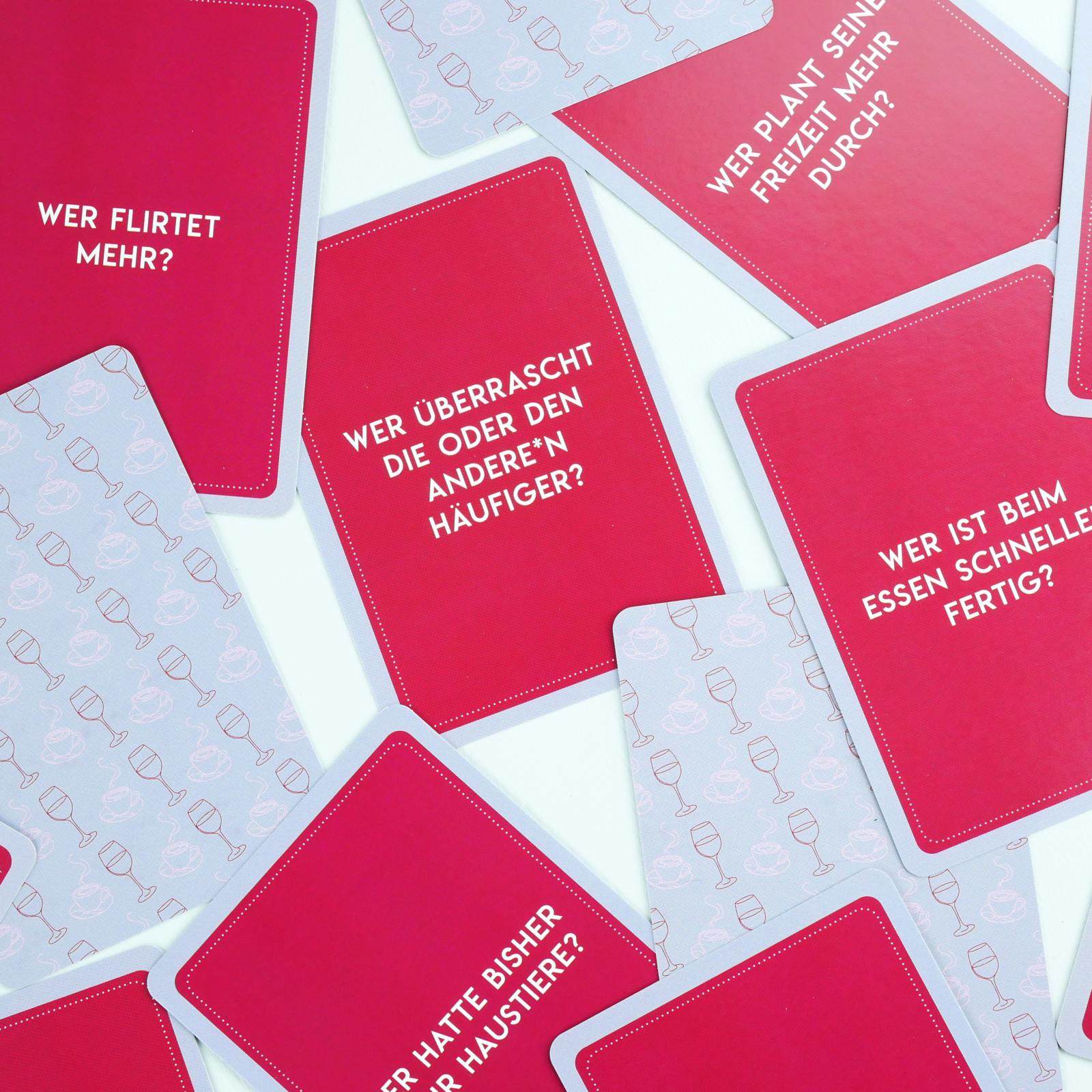 | Schlagworte | ab 16 • Austausch • Beziehung • Bindung vertiefen • challenge • couple goals • Dating • Deep Talk • Erlebnis • erstes Date • Flirten • Fragen • Gefühle • Geschenk für Freunde • Gesellschaftsspiel • Herzensmomente • Hochzeit • ice breaker • Ideen zu zweit • intime Gespräche • Kartenspiel • Kennenlernspiel • Kennlernquiz • Kommunikationsspiel • Kompatibilität • Liebe • Liebesquiz • Lieblingsmensch • lustig • Pärchenabend • Partner • passen wir zusammen • romantisch • schöne Momente • Schuhspiel • Single • Spiel • Stag • Valentinstag • Verliebte • Verlobung • Wer von uns • Zukunftspläne • Zweisamkeit |