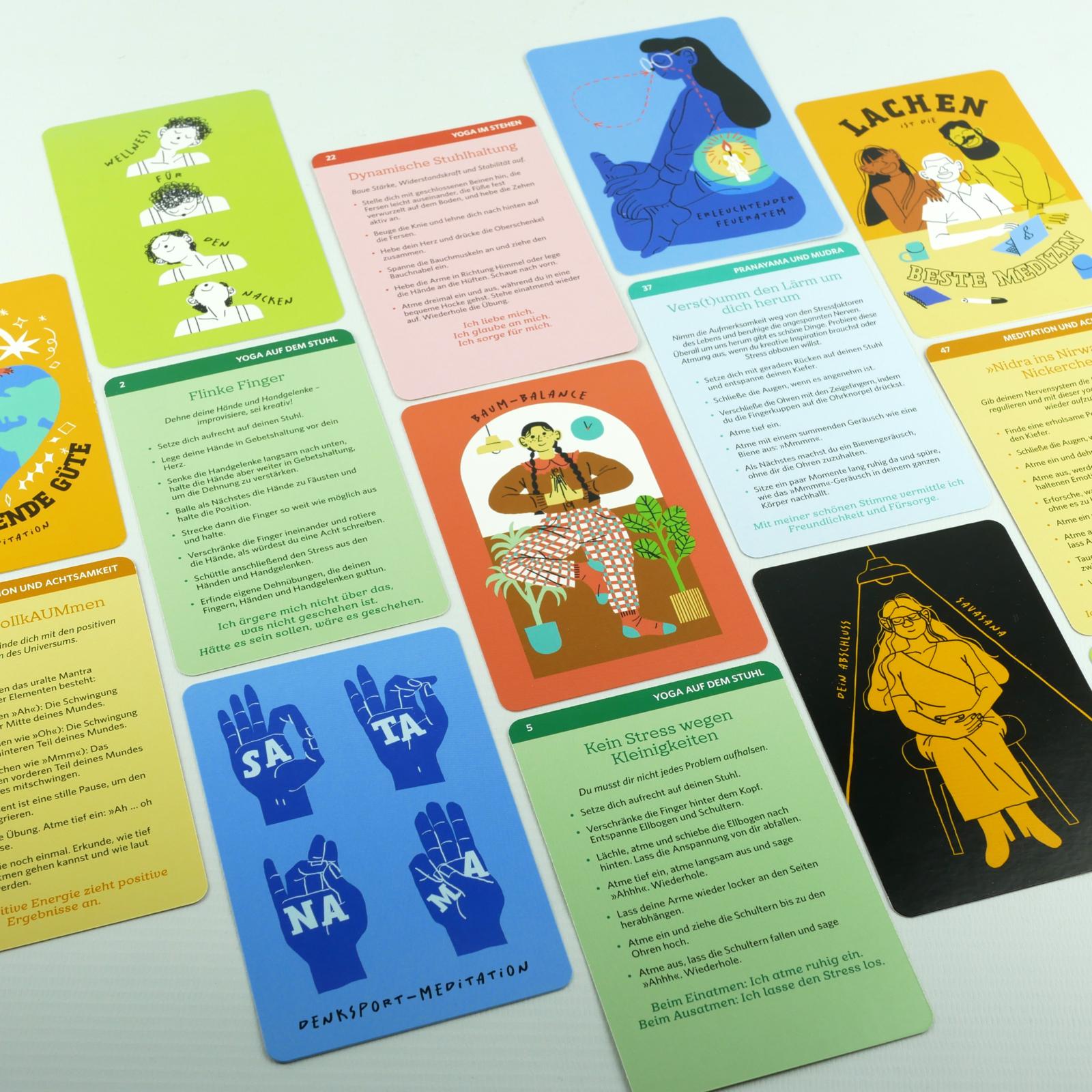 Ganz egal, ob du im Büro, von zu Hause oder von unterwegs arbeitest - die kurzen Asanas, Mudras und Meditationen lassen sich überall umsetzen. Ziehe einfach eine Karte und führe die beschriebene Anleitung aus oder stelle dir einen Miniflow zusammen. Ideal für zwei Minuten Auszeit zwischen Meetings und To-dos - ganz ohne Yogamatte!