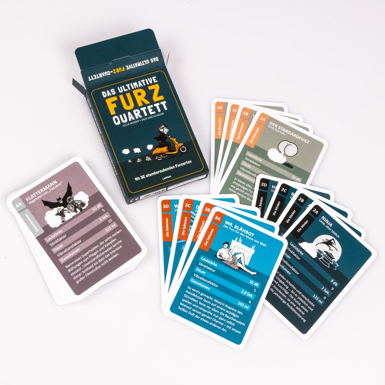 Das furztastischste Quartett aller Zeiten wartet auf seinen Einsatz beim Spieleabend oder als witziges Geschenk für den besten Freund oder Lieblingskollegen.