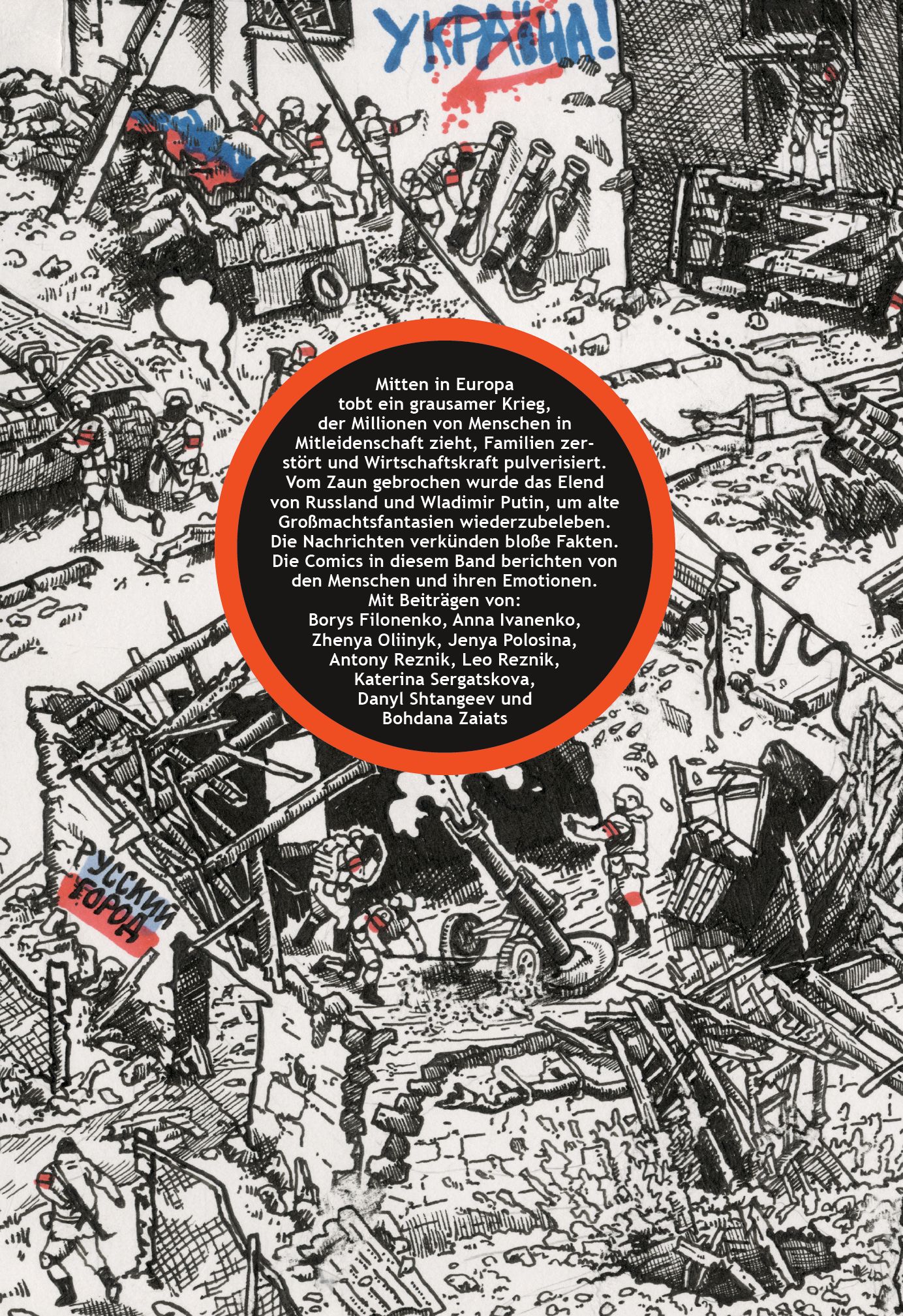 Mitten in Europa tobt ein grausamer Krieg, der Millionen von Menschen in Mitleidenschaft zieht, Familien zerstört und Wirtschaftskraft pulverisiert. Vom Zaun gebrochen wurde das Elend von Russland und Wladimir Putin, um alte Großmachtsfantasien wiederzubeleben. Die Nachrichten verkünden bloße Fakten. Die Comics in diesem Band berichten von den Menschen und ihren Emotionen.Mit Beiträgen von: Borys Filonenko, Anna Ivanenko, Zhenya Oliinyk, Jenya Polosina, Antony Reznik, Leo Reznik, Katerina Sergatskova, Danyl Shtangeev und Bohdana ZaiatsKatalogbuch zur gleichnamigen Ausstellung "UKRAINE COMICS - Leben in der Kriegszone" vom 6. Juni bis 2. November 2025 im schauraum: comic + cartoon Dortmund