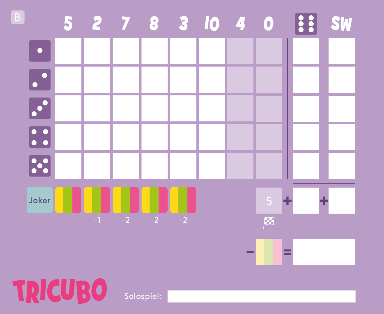| Schlagworte | Absacker • beste Freunde • Einfach und schnell • Familienspiel • Gastgeschenk • Geburtstagsgeschenk • Gewinnen • kurze Spieldauer • Mitbringspiel • Mitnehmspiel • Punkte • Roll and Write • Spaß • Spielblock • Spieleabend • Spielspaß • Taktik • Urlaub • wenige Regeln • witzig • Würfel • Würfelspiel |
