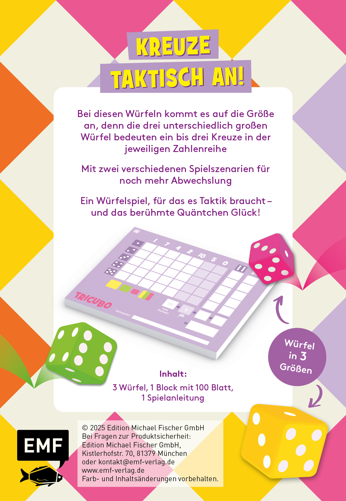 - Inhalt: Anleitungsheft, 3 Würfel in unterschiedlichen Größen, 1 Block mit 200 Seiten