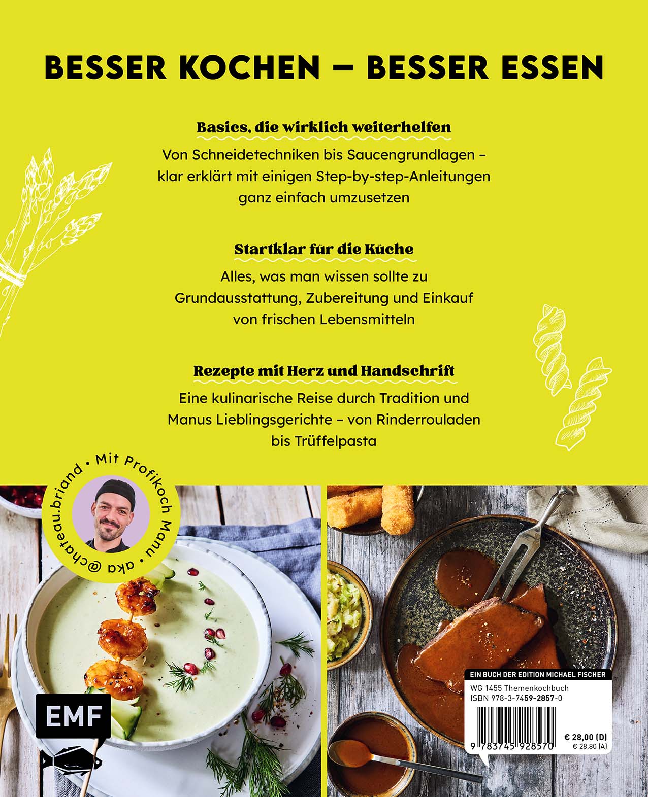 Manuel Struck, der beliebte Content Creator und Profikoch, den meisten besser bekannt als chateau.briand, hat mit sehr viel Herzblut eine anschauliche, leicht verständliche und innovative Kochschule geschrieben. Sie ist für alle geeignet, die gerade dabei sind, sich ihre ersten Sporen an Pfanne, Topf und Co zu verdienen. Und auch für alte Hasen am Herd gibt's noch einiges Wissenswerte zu entdecken, denn Manuels Kochwissen ist außergewöhnlich, er hat nicht nur sein Handwerk von der Pike auf gelernt, er ist auch immer offen für Neues, experimentiert gern und kann sich dabei jederzeit auf seinen untrüglichen Gaumen verlassen. Mit diesem geballten Wissen wird er nicht nur seine zahlreichen treuen Follower glücklich machen, sondern auch all diejenigen begeistern, die sich in der Küche bisher noch nicht ganz so viel zutrauen. Manu zeigt euch, wie's funktioniert. Versprochen!