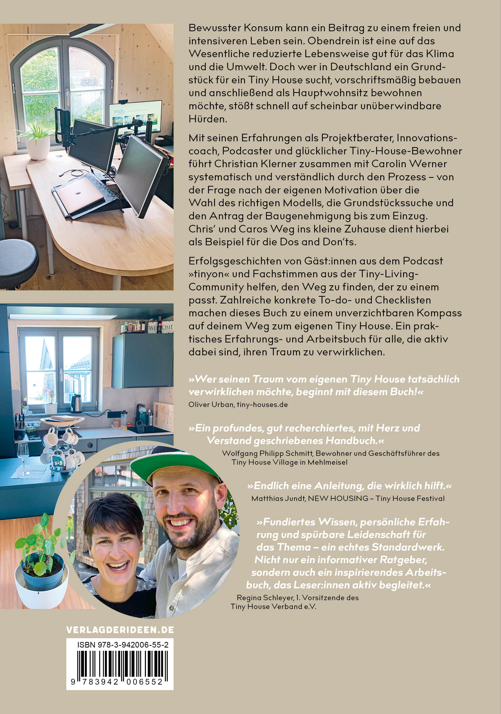 Mit seinen Erfahrungen als Projektberater, Innovationscoach, Podcaster und glücklicher Tiny-House-Bewohner führt Christian Klerner zusammen mit Carolin Werner systematisch und verständlich durch den Prozess – von der Frage nach der eigenen Motivation über die Wahl des richtigen Modells, die Grundstückssuche und den Antrag der Baugenehmigung bis zum Einzug. Chris’ und Caros Weg ins kleine Zuhause dient hierbei als Beispiel für die Dos and Don’ts.