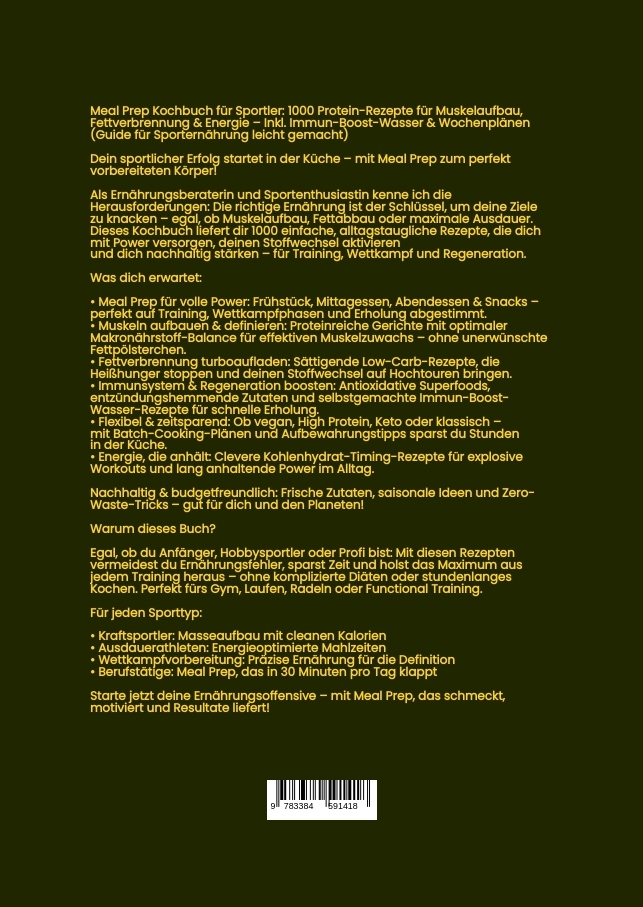 Meal Prep Kochbuch für Sportler: 1000 Protein-Rezepte für Muskelaufbau, Fettverbrennung & Energie - Inkl. Immun-Boost-Wasser & Wochenplänen (Guide für Sporternährung leicht gemacht)Dein sportlicher Erfolg startet in der Küche - mit Meal Prep zum perfekt vorbereiteten Körper!Als Ernährungsberaterin und Sportenthusiastin kenne ich die Herausforderungen: Die richtige Ernährung ist der Schlüssel, um deine Ziele zu knacken - egal, ob Muskelaufbau, Fettabbau oder maximale Ausdauer. Dieses Kochbuch liefert dir 1000 einfache, alltagstaugliche Rezepte, die dich mit Power versorgen, deinen Stoffwechsel aktivieren und dich nachhaltig stärken - für Training, Wettkampf und Regeneration.Was dich erwartet:- Meal Prep für volle Power: Frühstück, Mittagessen, Abendessen & Snacks - perfekt auf Training, Wettkampfphasen und Erholung abgestimmt.- Muskeln aufbauen & definieren: Proteinreiche Gerichte mit optimaler Makronährstoff-Balance für effektiven Muskelzuwachs - ohne unerwünschte Fettpölsterchen.- Fettverbrennung turboaufladen: Sättigende Low-Carb-Rezepte, die Heißhunger stoppen und deinen Stoffwechsel auf Hochtouren bringen.- Immunsystem & Regeneration boosten: Antioxidative Superfoods, entzündungshemmende Zutaten und selbstgemachte Immun-Boost-Wasser-Rezepte für schnelle Erholung.- Flexibel & zeitsparend: Ob vegan, High Protein, Keto oder klassisch - mit Batch-Cooking-Plänen und Aufbewahrungstipps sparst du Stunden in der Küche.- Energie, die anhält: Clevere Kohlenhydrat-Timing-Rezepte für explosive Workouts und lang anhaltende Power im Alltag.Nachhaltig & budgetfreundlich: Frische Zutaten, saisonale Ideen und Zero-Waste-Tricks - gut für dich und den Planeten!Warum dieses Buch?Egal, ob du Anfänger, Hobbysportler oder Profi bist: Mit diesen Rezepten vermeidest du Ernährungsfehler, sparst Zeit und holst das Maximum aus jedem Training heraus - ohne komplizierte Diäten oder stundenlanges Kochen. Perfekt fürs Gym, Laufen, Radeln oder Functional Training.Für jeden Sporttyp:- Kraftsportler: Masseaufbau mit cleanen Kalorien- Ausdauerathleten: Energieoptimierte Mahlzeiten- Wettkampfvorbereitung: Präzise Ernährung für die Definition- Berufstätige: Meal Prep, das in 30 Minuten pro Tag klapptStarte jetzt deine Ernährungsoffensive - mit Meal Prep, das schmeckt, motiviert und Resultate liefert!
