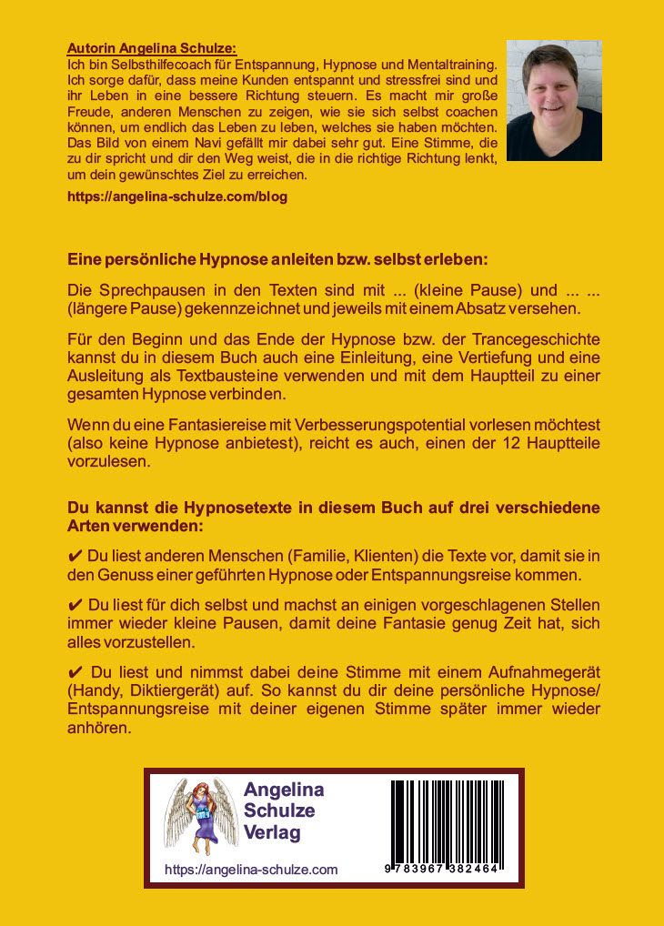 Autorin Angelina Schulze: Ich bin Selbsthilfecoach für Entspannung, Hypnose und Mentaltraining. Ich sorge dafür, dass meine Kunden entspannt und stressfrei sind und ihr Leben in eine bessere Richtung steuern. Es macht mir große Freude, anderen Menschen zu zeigen, wie sie sich selbst coachen können, um endlich das Leben zu leben, welches sie haben möchten. Das Bild von einem Navi gefällt mir dabei sehr gut. Eine Stimme, die zu dir spricht und dir den Weg weist, die in die richtige Richtung lenkt, um dein gewünschtes Ziel zu erreichen. https://entspannen-lernen.info
