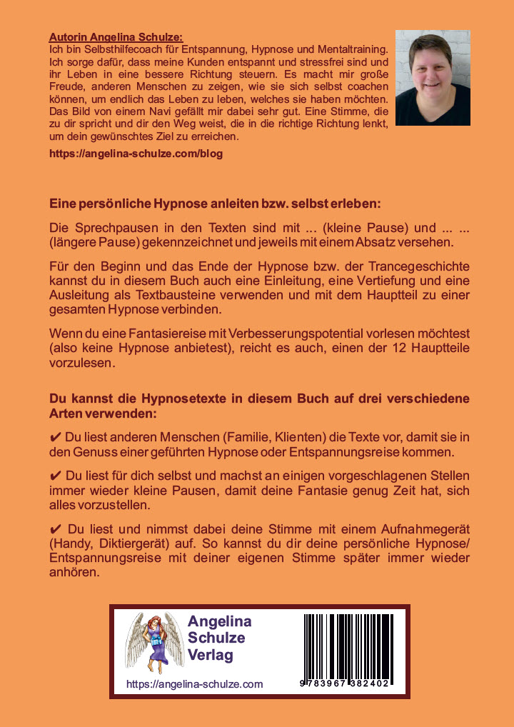 | Schlagworte | Energie • Entspannung • entspannung geschenk • Entspannungsgeschichten • Entspannungsreise • Fantasiegeschichten • Fantasiereise • Fantasiereisen • Fantasiereisen für Erwachsene • Hypnose • Hypnosearbeit • Hypnose Buch • Hypnose für die Praxis • Hypnosegeschichten • hypnose lernen • Hypnosereise • Hypnoseskripte • Hypnosetexte • Hypnose Texte • Hypnostetexte zum Vorlesen • Hypnotherapie • Müdigkeit • Mut • Persönlichkeitsentwicklung • Phantasiegeschichten • Phantasiereise • Power • selbstbewusstsein stärken • Selbsthypnose • Selbsthypnose Anleitung • Selbsthypnose Texte • sich entspannen • Spirituelle Reisen • Trance • Trancearbeit • Trancegeschichten • Trancereise • Traumreisen • Visualisierungen |
