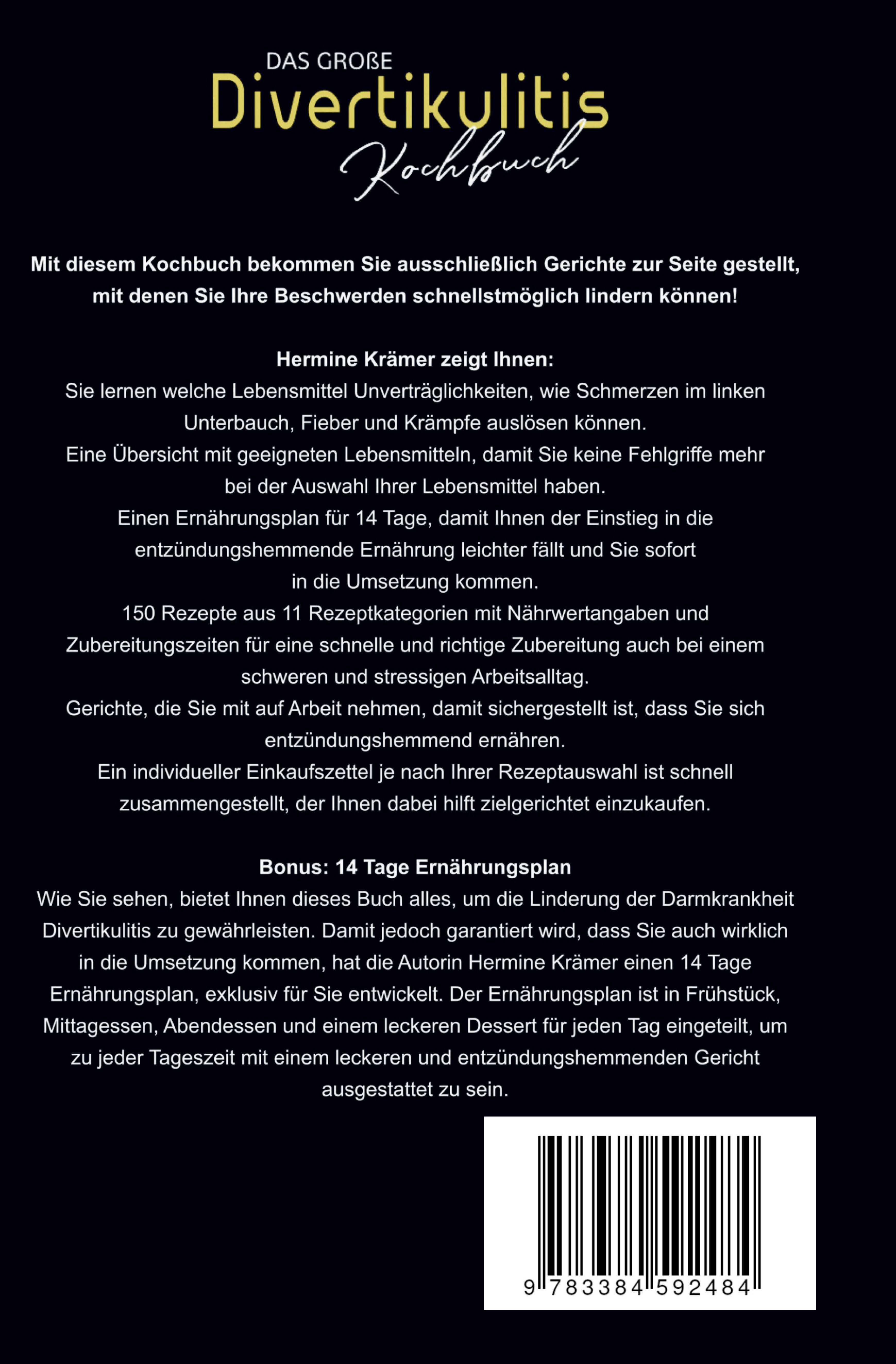 Wenn Verdauungsbeschwerden, Blähungen, Verstopfung oder Schmerzen im Alltag zur Belastung werden, kann eine gezielte Ernährung den entscheidenden Unterschied machen. "Das große Divertikulitis Kochbuch" ist dein praktischer Wegbegleiter für eine darmfreundliche, entzündungshemmende Ernährung - mit Genuss und Leichtigkeit.Dieses Kochbuch richtet sich an alle, die unter Divertikulitis leiden und nach alltagstauglichen Lösungen suchen, um Beschwerden zu lindern, das Wohlbefinden zu steigern und die Ernährung gezielt umzustellen - ohne ständigen Verzicht.Hermine Krämer, erfahrene Expertin für entzündungshemmende Ernährung, zeigt dir Schritt für Schritt, welche Lebensmittel den Darm entlasten können und wie du typische Auslöser vermeidest. Neben einem klaren Überblick über empfehlenswerte Lebensmittel bietet das Buch:- 150 ausgewählte Rezepte, ideal für die akute Phase, Erholungszeit oder langfristige Ernährung- Nährwertangaben & Zubereitungszeiten, für einfache Planung auch im stressigen Alltag- Gerichte zum Mitnehmen, damit du auch unterwegs darmfreundlich essen kannst- Einen 14-Tage-Ernährungsplan, mit strukturierten Mahlzeiten für jede Tageszeit - inkl. Frühstück, Mittag, Abendessen & Desserts- Einkaufslisten-Tipps, damit du gezielt und effizient einkaufstEgal ob du am Beginn deiner Diagnose stehst oder bereits Erfahrungen mit Divertikulitis gemacht hast - dieses Buch liefert dir das nötige Wissen, leckere Rezepte und strukturierte Unterstützung, um aktiv etwas für deine Darmgesundheit zu tun."Das große Divertikulitis Kochbuch" ist mehr als nur ein Rezeptbuch - es ist ein praktischer Ratgeber für ein besseres Bauchgefühl, mehr Energie im Alltag und neue Lebensqualität.