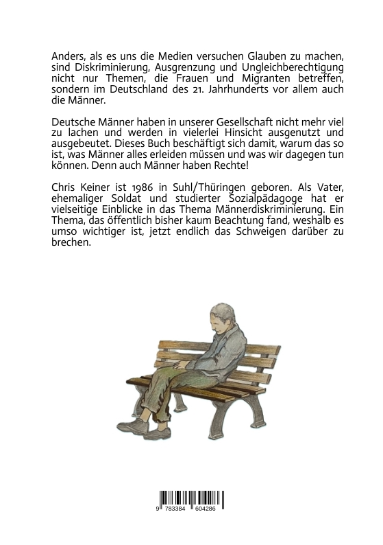 Anders, als es uns die Medien versuchen Glauben zu machen, sind Diskriminierung, Ausgrenzung und Un-gleichberechtigung nicht nur Themen, die Frauen und Migranten betreffen, sondern im Deutschland des 21. Jahrhunderts vor allem auch die Männer.Deutsche Männer haben in unserer Gesellschaft nicht mehr viel zu lachen und werden in vielerlei Hinsicht ausgenutzt und ausgebeutet. Dieses Buch beschäftigt sich damit, warum das so ist, was Männer alles erleiden müssen und was wir dagegen tun können. Denn auch Männer haben Rechte!Chris Keiner ist 1986 in Suhl/Thüringen geboren. Als Vater, ehemaliger Soldat und studierter Sozialpädagoge hat er vielseitige Einblicke in das Thema Männerdiskriminierung. Ein Thema, das öffentlich bisher kaum Beachtung fand, weshalb es umso wichtiger ist, jetzt endlich das Schweigen darüber zu brechen.