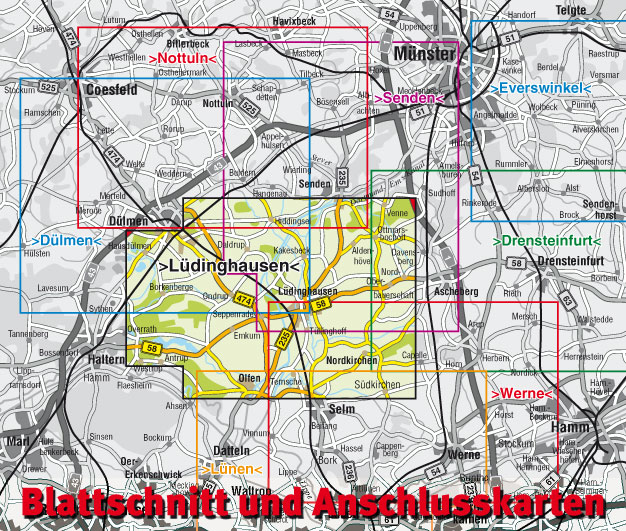 Umgebungskarte, um bis in alle Nachbarorte zu kommen: Dülmen, Senden, Ottmarsbochold, Nordkirchen, Selm, Olfen, Hullern.