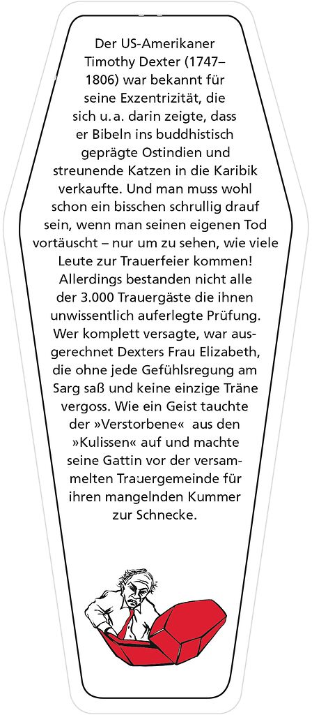 Der Umstand, irgendwann den Löffel abgeben zu müssen, mag so unvermeidlich wie unerfreulich sein – doch wer sagt, dass man daraus nicht trotzdem das Beste machen kann? Es gibt so viele abenteuerliche, skurrile, absurde – und manchmal ganz schön illegale! – Möglichkeiten, seine Ewige Ruhe zu zelebrieren. Und so beginnt Ab in die Kiste! da, wo die meisten anderen black stories enden: mit dem Tod. Denn hier geht es um das, was danach passiert! Und alles ist exakt genau so passiert wie beschrieben. Erscheint in einer einmaligen und limitieren Sonderausstattung in Sargform mit Sound: Beim Öffnen des Sargdeckels ertönt ein schauriges Lachen.