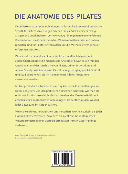 Detaillierte anatomische Abbildungen in Farbe, Fachtexte und praktische Schritt-für-Schritt-Anleitungen machen dieses Buch zu einem einzigartigen und unschätzbaren Lernwerkzeug für angehende oder erfahrene Pilates-Lehrer, dieihr anatomisches Wissen erweitern oder auffrischen möchten, und für Pilates Enthusiasten, die die Methode etwas genauer erforschen möchten. Dieses praktische und leicht verständliche Handbuch beginnt mit einem Überblicküber die menschliche Anatomie, bevor es sich mit den Ursprüngen und der Geschichte von Pilates, seiner Entwicklung und seinen Grundprinzipien befasst. Es stellt einige der gängigen Hilfsmittel und Studiogeräte vor, die im Rahmen einesPilates-Programms verwendet werden. Im Hauptteil des Buchs werden dann 25 klassische Pilates-Übungen im Detailanalysiert, von den praktischen einzelnen Schritten, wie man die optimale Position erreicht, bis hin zur Analyse der Muskelaktivität mit anschaulichen anatomischen Abbildungen, die deutlich zeigen, was bei jeder Bewegung im Körper passiert.Wenn Sie sich veranschaulichen und verstehen, welche Muskeln bei jeder Haltung aktiviert werden, erweitern Sie nicht nur Ihr anatomisches Wissen, sondern können auch die Effektivität Ihres Pilates-Trainings verbessern.