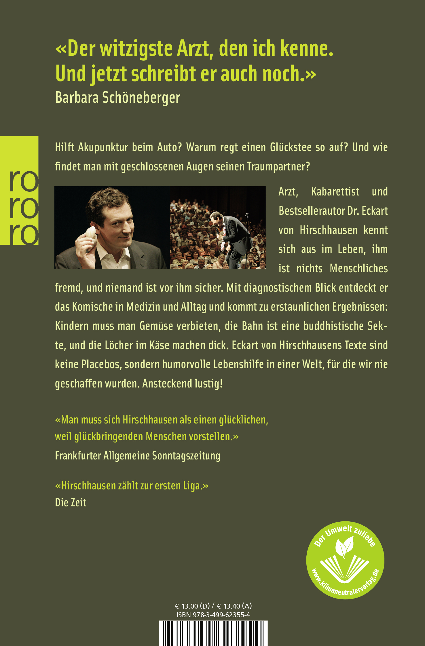 Arzt, Kabarettist und Bestsellerautor Dr. Eckart von Hirschhausen kennt sich aus im Leben, ihm ist nichts Menschliches fremd, und niemand ist vor ihm sicher. Mit diagnostischem Blick entdeckt er das Komische in Medizin und Alltag und kommt zu erstaunlichen Ergebnissen: Kindern muss man Gemüse verbieten, die Bahn ist eine buddhistische Sekte, und die Löcher im Käse machen dick. Eckart von Hirschhausens Texte sind keine Placebos, sondern humorvolle Lebenshilfe in einer Welt, für die wir nie geschaffen wurden.