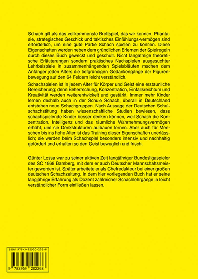 Schach gilt als das vollkommenste Brettspiel, das wir kennen. Phantasie, strategisches Geschick und taktisches Einfühlungsvermögen sind erforderlich, um eine gute Partie Schach spielen zu können. Diese Eigenschaften werden neben dem gründlichen Erlernen der Spielregeln durch dieses Buch geweckt und geschult. Nicht langatmige theoretische Erläuterungen sondern praktisches Nachspielen ausgesuchter Lehrbeispiele in zusammenhängenden Spielabläufen machen dem Anfänger jeden Alters die tiefgründigen Gedankengänge der Figurenbewegung auf den 64 Feldern leicht verständlich.Schachspielen ist in jedem Alter für Körper und Geist eine erstaunliche Bereicherung; denn Beherrschung, Konzentration, Einfallsreichtum und Kreativität werden weiterentwickelt und gestärkt. Immer mehr Kinder lernen deshalb auch in der Schule Schach, überall in Deutschland entstehen neue Schachgruppen. Nach Aussage der Deutschen Schulschachstiftung haben wissenschaftliche Studien bewiesen, dass schachspielende Kinder besser denken können, weil Schach die Konzentration, Intelligenz und das räumliche Wahrnehmungsvermögen erhöht, und sie Denkstrukturen aufbauen lernen. Aber auch für Menschen bis ins hohe Alter ist das Training dieser Eigenschaften unerlässlich; sie werden beim Schachspiel besonders intensiv und nachhaltig gefördert und erhalten so den Geist beweglich und frisch. Günter Lossa war zu seiner aktiven Zeit langjähriger Bundesligaspieler des SC 1868 Bamberg, mit dem er auch Deutscher Mannschaftsmeister geworden ist. Später arbeitete er als Chefredakteur bei einer großen deutschen Schachzeitung. In dem hier vorliegenden Buch hat er seine langjährige Erfahrung als Dozent zahlreicher Schachlehrgänge in leicht verständlicher Form einfließen lassen.