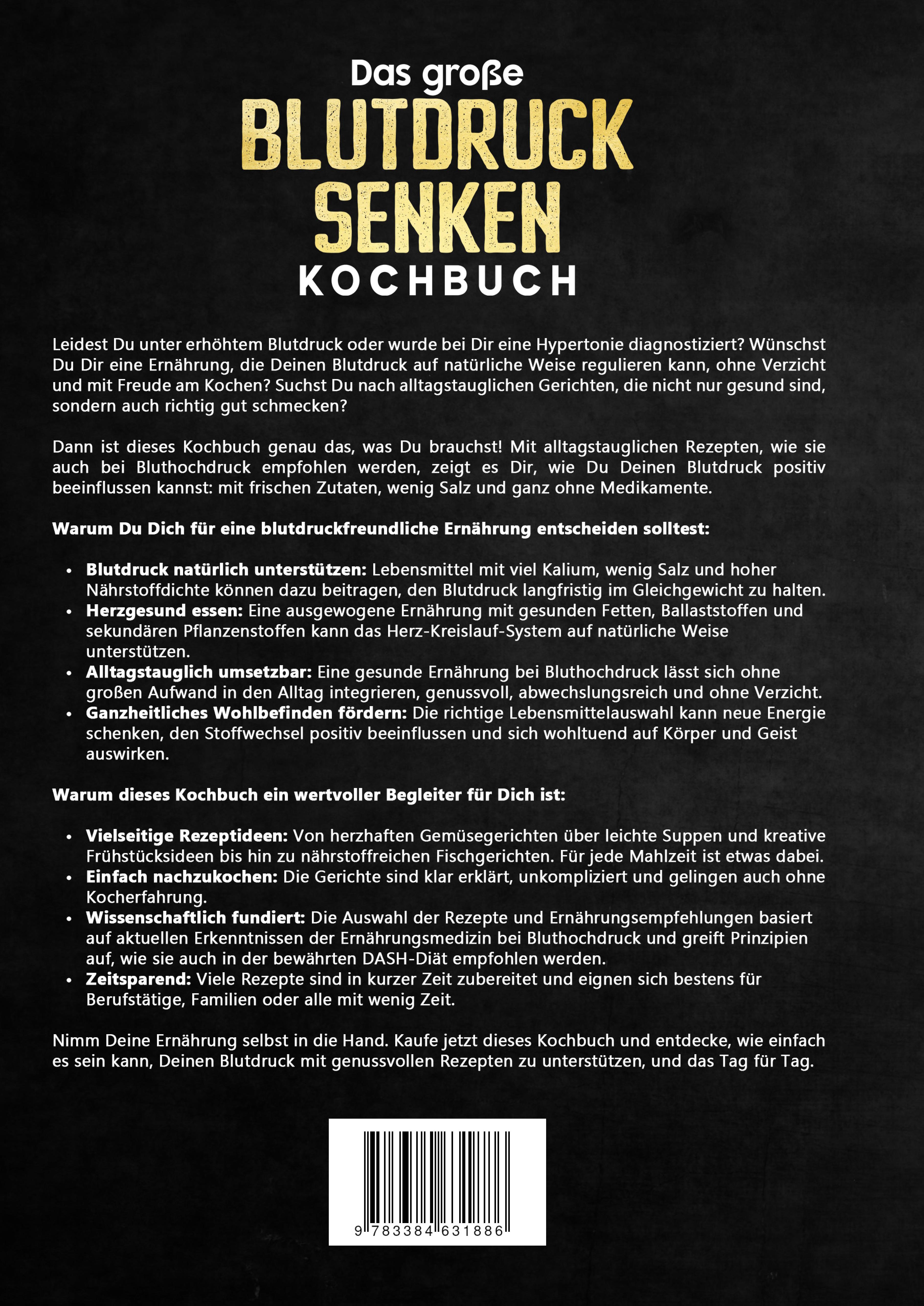 Leidest Du unter erhöhtem Blutdruck oder wurde bei Dir eine Hypertonie diagnostiziert? Wünschst Du Dir eine Ernährung, die Deinen Blutdruck auf natürliche Weise regulieren kann, ohne Verzicht und mit Freude am Kochen? Suchst Du nach alltagstauglichen Gerichten, die nicht nur gesund sind, sondern auch richtig gut schmecken? Dann ist dieses Kochbuch genau das, was Du brauchst! Mit alltagstauglichen Rezepten, wie sie auch bei Bluthochdruck empfohlen werden, zeigt es Dir, wie Du Deinen Blutdruck positiv beeinflussen kannst: mit frischen Zutaten, wenig Salz und ganz ohne Medikamente.Warum Du Dich für eine blutdruckfreundliche Ernährung entscheiden solltest:- Blutdruck natürlich unterstützen: Lebensmittel mit viel Kalium, wenig Salz und hoher Nährstoffdichte können dazu beitragen, den Blutdruck langfristig im Gleichgewicht zu halten.- Herzgesund essen: Eine ausgewogene Ernährung mit gesunden Fetten, Ballaststoffen und sekundären Pflanzenstoffen kann das Herz-Kreislauf-System auf natürliche Weise unterstützen.- Alltagstauglich umsetzbar: Eine gesunde Ernährung bei Bluthochdruck lässt sich ohne großen Aufwand in den Alltag integrieren, genussvoll, abwechslungsreich und ohne Verzicht.- Ganzheitliches Wohlbefinden fördern: Die richtige Lebensmittelauswahl kann neue Energie schenken, den Stoffwechsel positiv beeinflussen und sich wohltuend auf Körper und Geist auswirken.Warum dieses Kochbuch ein wertvoller Begleiter für Dich ist:- Vielseitige Rezeptideen: Von herzhaften Gemüsegerichten über leichte Suppen und kreative Frühstücksideen bis hin zu nährstoffreichen Fischgerichten. Für jede Mahlzeit ist etwas dabei.- Einfach nachzukochen: Die Gerichte sind klar erklärt, unkompliziert und gelingen auch ohne Kocherfahrung.- Wissenschaftlich fundiert: Die Auswahl der Rezepte und Ernährungsempfehlungen basiert auf aktuellen Erkenntnissen der Ernährungsmedizin bei Bluthochdruck und greift Prinzipien auf, wie sie auch in der bewährten DASH-Diät empfohlen werden.- Zeitsparend: Viele Rezepte sind in kurzer Zeit zubereitet und eignen sich bestens für Berufstätige, Familien oder alle mit wenig Zeit.Nimm Deine Ernährung selbst in die Hand. Kaufe jetzt dieses Kochbuch und entdecke, wie einfach es sein kann, Deinen Blutdruck mit genussvollen Rezepten zu unterstützen, und das Tag für Tag.