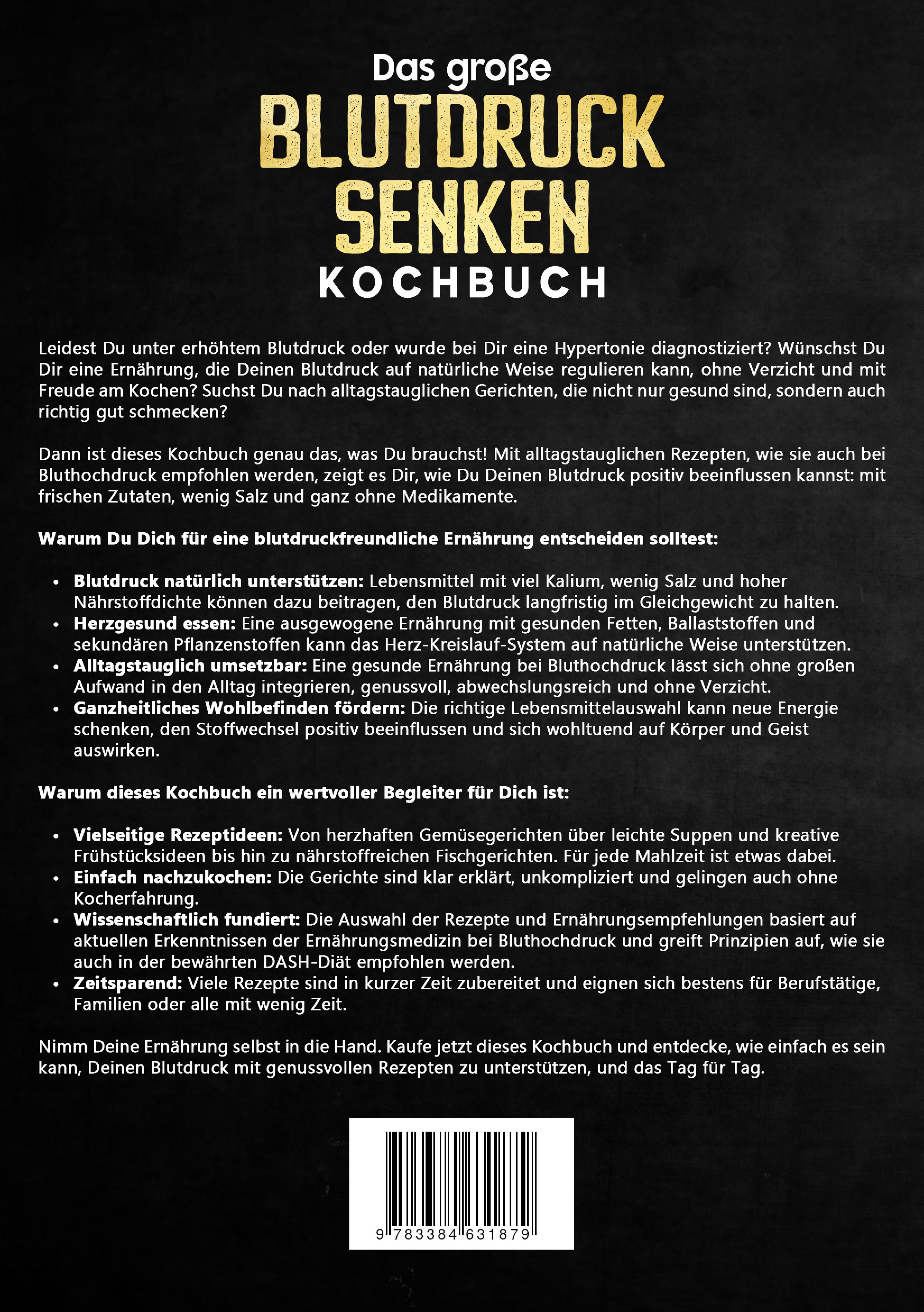 Leidest Du unter erhöhtem Blutdruck oder wurde bei Dir eine Hypertonie diagnostiziert? Wünschst Du Dir eine Ernährung, die Deinen Blutdruck auf natürliche Weise regulieren kann, ohne Verzicht und mit Freude am Kochen? Suchst Du nach alltagstauglichen Gerichten, die nicht nur gesund sind, sondern auch richtig gut schmecken? Dann ist dieses Kochbuch genau das, was Du brauchst! Mit alltagstauglichen Rezepten, wie sie auch bei Bluthochdruck empfohlen werden, zeigt es Dir, wie Du Deinen Blutdruck positiv beeinflussen kannst: mit frischen Zutaten, wenig Salz und ganz ohne Medikamente.Warum Du Dich für eine blutdruckfreundliche Ernährung entscheiden solltest:- Blutdruck natürlich unterstützen: Lebensmittel mit viel Kalium, wenig Salz und hoher Nährstoffdichte können dazu beitragen, den Blutdruck langfristig im Gleichgewicht zu halten.- Herzgesund essen: Eine ausgewogene Ernährung mit gesunden Fetten, Ballaststoffen und sekundären Pflanzenstoffen kann das Herz-Kreislauf-System auf natürliche Weise unterstützen.- Alltagstauglich umsetzbar: Eine gesunde Ernährung bei Bluthochdruck lässt sich ohne großen Aufwand in den Alltag integrieren, genussvoll, abwechslungsreich und ohne Verzicht.- Ganzheitliches Wohlbefinden fördern: Die richtige Lebensmittelauswahl kann neue Energie schenken, den Stoffwechsel positiv beeinflussen und sich wohltuend auf Körper und Geist auswirken.Warum dieses Kochbuch ein wertvoller Begleiter für Dich ist:- Vielseitige Rezeptideen: Von herzhaften Gemüsegerichten über leichte Suppen und kreative Frühstücksideen bis hin zu nährstoffreichen Fischgerichten. Für jede Mahlzeit ist etwas dabei.- Einfach nachzukochen: Die Gerichte sind klar erklärt, unkompliziert und gelingen auch ohne Kocherfahrung.- Wissenschaftlich fundiert: Die Auswahl der Rezepte und Ernährungsempfehlungen basiert auf aktuellen Erkenntnissen der Ernährungsmedizin bei Bluthochdruck und greift Prinzipien auf, wie sie auch in der bewährten DASH-Diät empfohlen werden.- Zeitsparend: Viele Rezepte sind in kurzer Zeit zubereitet und eignen sich bestens für Berufstätige, Familien oder alle mit wenig Zeit.Nimm Deine Ernährung selbst in die Hand. Kaufe jetzt dieses Kochbuch und entdecke, wie einfach es sein kann, Deinen Blutdruck mit genussvollen Rezepten zu unterstützen, und das Tag für Tag.