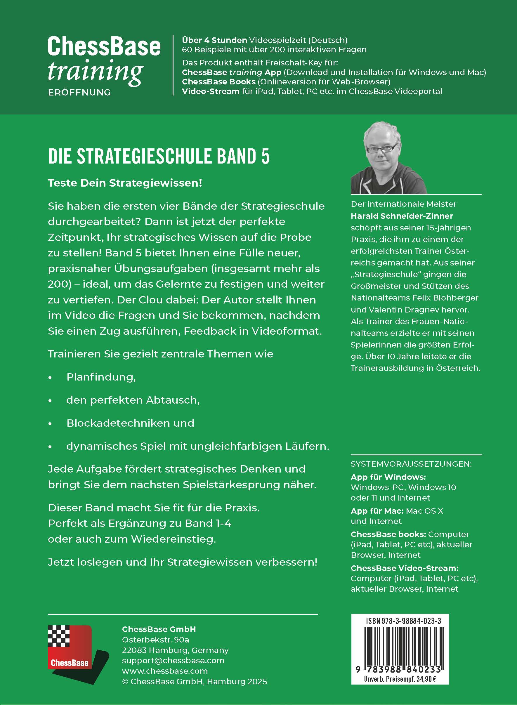 Sie haben die ersten vier Bände der Strategieschule durchgearbeitet? Dann ist jetzt der perfekte Zeitpunkt, Ihr strategisches Wissen auf die Probe zu stellen! Band 5 bietet Ihnen eine Fülle neuer, praxisnaher Übungsaufgaben (insgesamt mehr als200) - ideal, um das Gelernte zu festigen und weiter zu vertiefen. Der Clou dabei: Der Autor stellt Ihnen im Video die Fragen und Sie bekommen, nachdem Sie einen Zug ausführen, Feedback in Videoformat.Trainieren Sie gezielt zentrale Themen wie- Planfindung,- den perfekten Abtausch,- Blockadetechniken und- dynamisches Spiel mit ungleichfarbigen Läufern.Jede Aufgabe fördert strategisches Denken und bringt Sie dem nächsten Spielstärkesprung näher. Dieser Band macht Sie fit für die Praxis. Perfekt als Ergänzung zu Band 1-4 oder auch zum Wiedereinstieg. Jetzt loslegen und Ihr Strategiewissen verbessern!SYSTEMVORAUSSETZUNGEN:App für Windows: Windows-PC, Windows 10 oder 11 und InternetApp für Mac: Mac OS X und InternetChessBase books: Computer (iPad, Tablet, PC etc), aktueller Browser, Internet ChessBase Video-Stream: Computer (iPad, Tablet, PC etc), aktueller Browser, InternetDieses Produkt enthält KEINE DVD-ROM, sondern einen Freischaltcode für Download und Installation
