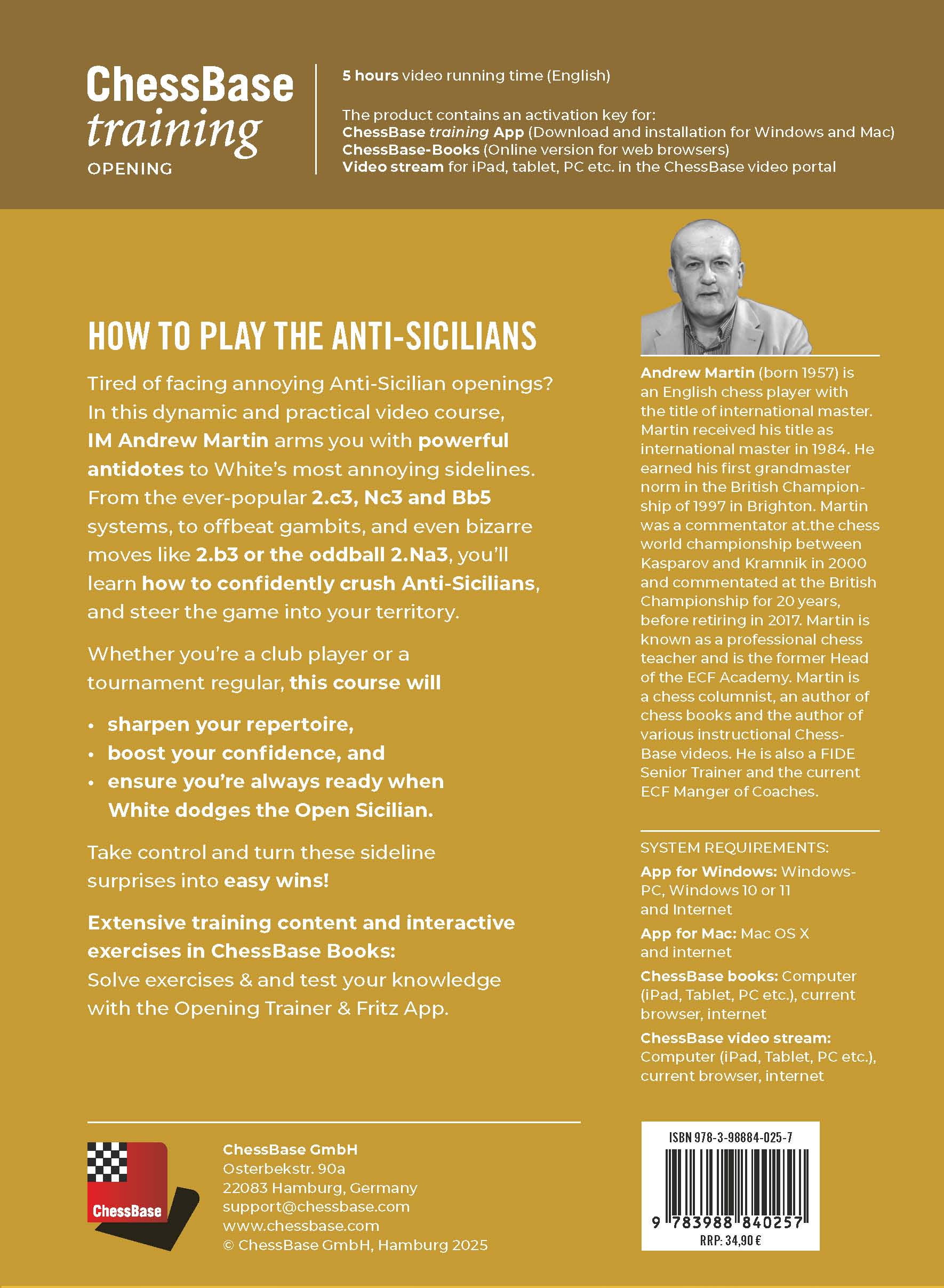 Tired of facing annoying Anti-Sicilian openings? In this dynamic and practical video course, IM Andrew Martin arms you with powerful antidotes to White’s most annoying sidelines. From the ever-popular 2.c3, Nc3 and Bb5 systems, to offbeat gambits, and even bizarre moves like 2.b3 or the oddball 2.Na3, you’ll