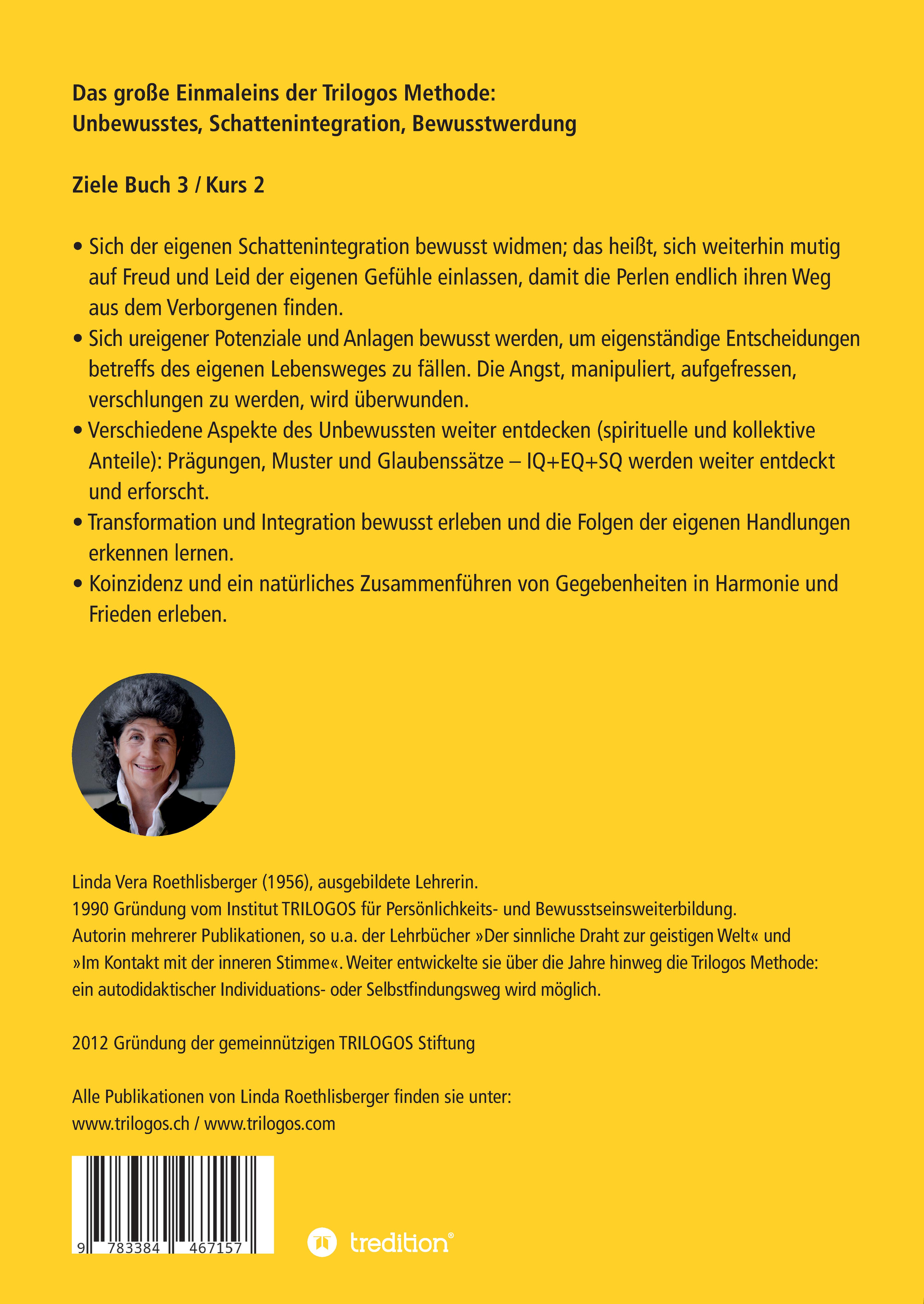 Linda Vera Roethlisberger (1956), ausgebildete Lehrerin Parallel dazu bildete sie in Bern und Paris ihr Talent als Künstlerin aus. Ihre eigenen medialen Anlagen bildete sie weiter als Schülerin von Silvia Wallimann, Prof. Dr. Milan Ryzl und Gordon Higginson und arbeitet seither u.a. auch als Medium. 1990 Gründung vom Institut TRILOGOS für Persönlichkeits- und Bewusstseinsschulung. Autorin mehrerer Publikationen, so u.a. der Lehrbücher »Der sinnliche Draht zur geistigen Welt« und »Im Kontakt mit der inneren Stimme«. Weiter entwickelte sie über die Jahre hinweg die TRILOGOS®Methode: ein autodidaktischer Individuations- oder Selbstfindungsweg wird möglich. 2012 Gründung der gemeinnützigen TRILOGOS Stiftung. _______________________________________________________________________________ Linda Vera Roethlisberger (1956), certified teacher At the same time, she developed her artistic talent in Bern and Paris. She developed and cultivated her own mediumistic capabilities as a student of Silvia Wallimann, Prof. Dr. Milan Ryzl and Gordon Higginson, and has since also been working as a medium. 1990 — Founding of TRILOGOS, an institute for personality and consciousness training. Author of numerous publications, among them the guidebooks The Sensory Channel to the Spiritual World (Der sinnliche Draht zur geistigen Welt) and In Touch With Your Inner Voice (Im Kontakt mit der inneren Stimme). Over the years, she has also developed the Trilogos Method, allowing for self-guided individuation or self-discovery. 2012 — Founding of the charitable Trilogos Foundation