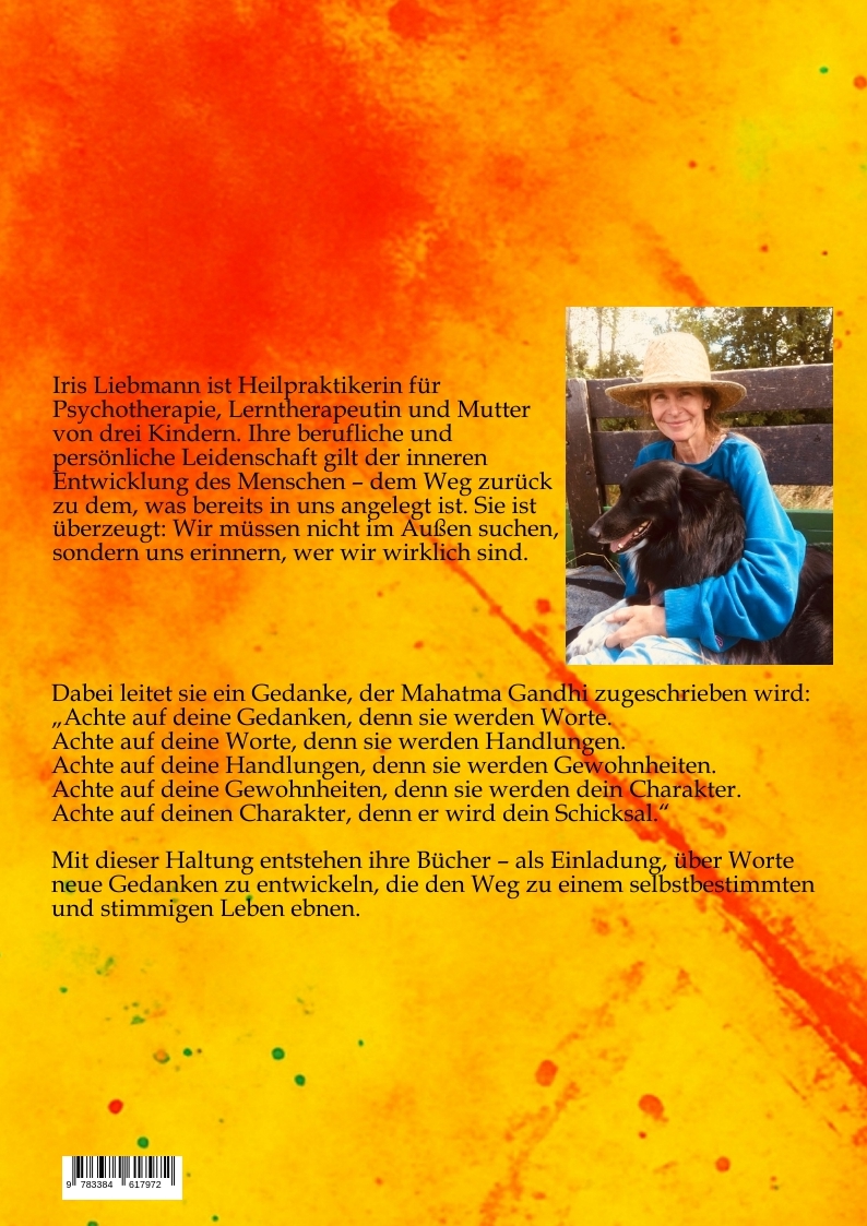 Iris Liebmann, 1964 in Lübeck geboren und aufgewachsen. Als Mutter von drei wunderbaren Kindern arbeitete sie selbstständig als Lerntherapeutin und entdeckte bald, dass hinter den Lernproblemen ganz andere Themen steckten. Sie wurde zur Hobbypsychologin und begann, Kurse zu belegen, Seminare zu besuchen, machte den Heilpraktiker für Psychotherapie und las Fachliteratur. Auf ihrem Weg waren ihre tierischen Begleiter Hund Murphy und Pferd Roxy wichtige und haltgebende Kameraden. Wegkucken gilt nicht, dieser Haltung entsprechend stellt sie sich noch immer allen Herausforderungen, um die beste Lösung zu finden.
