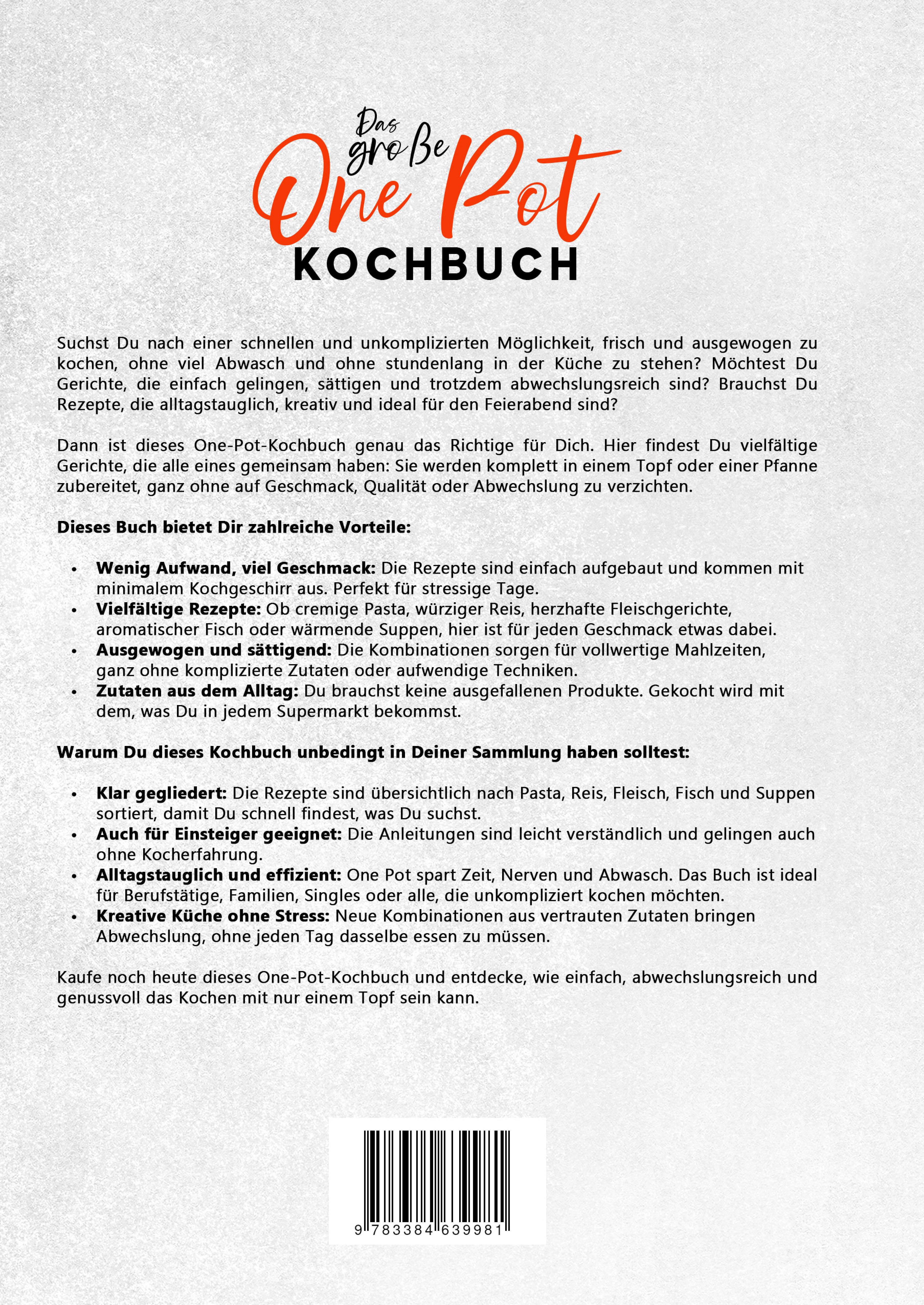 Suchst Du nach einer schnellen und unkomplizierten Möglichkeit, frisch und ausgewogen zu kochen, ohne viel Abwasch und ohne stundenlang in der Küche zu stehen? Möchtest Du Gerichte, die einfach gelingen, sättigen und trotzdem abwechslungsreich sind? Brauchst Du Rezepte, die alltagstauglich, kreativ und ideal für den Feierabend sind?Dann ist dieses One-Pot-Kochbuch genau das Richtige für Dich. Hier findest Du vielfältige Gerichte, die alle eines gemeinsam haben: Sie werden komplett in einem Topf oder einer Pfanne zubereitet, ganz ohne auf Geschmack, Qualität oder Abwechslung zu verzichten.Dieses Buch bietet Dir zahlreiche Vorteile:- Wenig Aufwand, viel Geschmack: Die Rezepte sind einfach aufgebaut und kommen mit minimalem Kochgeschirr aus. Perfekt für stressige Tage.- Vielfältige Rezepte: Ob cremige Pasta, würziger Reis, herzhafte Fleischgerichte, aromatischer Fisch oder wärmende Suppen, hier ist für jeden Geschmack etwas dabei.- Ausgewogen und sättigend: Die Kombinationen sorgen für vollwertige Mahlzeiten, ganz ohne komplizierte Zutaten oder aufwendige Techniken.- Zutaten aus dem Alltag: Du brauchst keine ausgefallenen Produkte. Gekocht wird mit dem, was Du in jedem Supermarkt bekommst.Warum Du dieses Kochbuch unbedingt in Deiner Sammlung haben solltest:- Klar gegliedert: Die Rezepte sind übersichtlich nach Pasta, Reis, Fleisch, Fisch und Suppen sortiert, damit Du schnell findest, was Du suchst.- Auch für Einsteiger geeignet: Die Anleitungen sind leicht verständlich und gelingen auch ohne Kocherfahrung.- Alltagstauglich und effizient: One Pot spart Zeit, Nerven und Abwasch. Das Buch ist ideal für Berufstätige, Familien, Singles oder alle, die unkompliziert kochen möchten.- Kreative Küche ohne Stress: Neue Kombinationen aus vertrauten Zutaten bringen Abwechslung, ohne jeden Tag dasselbe essen zu müssen.Kaufe noch heute dieses One-Pot-Kochbuch und entdecke, wie einfach, abwechslungsreich und genussvoll das Kochen mit nur einem Topf sein kann.