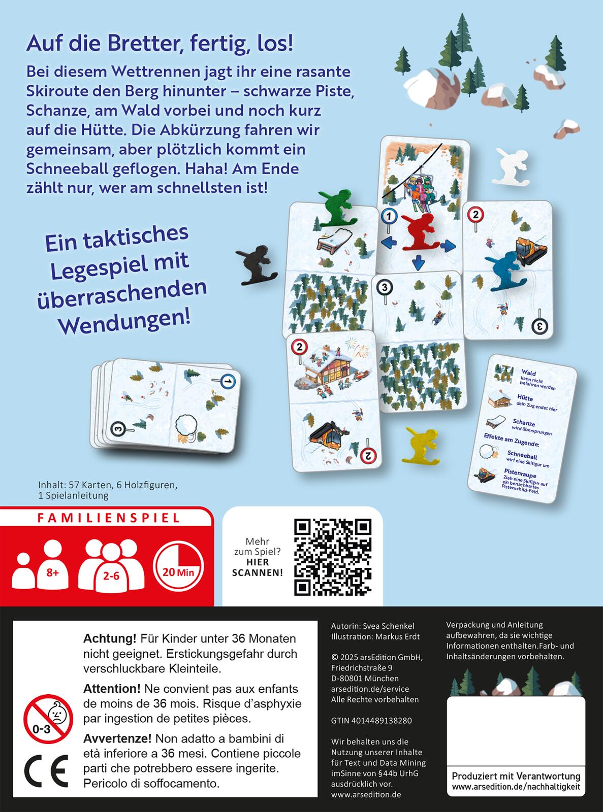 Mit dem Kartenspiel Pistengaudi erlebst du eine actiongeladene Abfahrt über steile Pisten. Gemeinsam entdeckt ihr eine aufregende Skiroute - vorbei an Hütten, durch Wälder und über Schanzen. Zusammenarbeit bringt euch schneller ins Tal, doch nur mit einer cleveren Strategie kannst du das Rennen gewinnen. Ein schnelles, taktisches Abenteuer voller Überraschungen und Winterspaß.