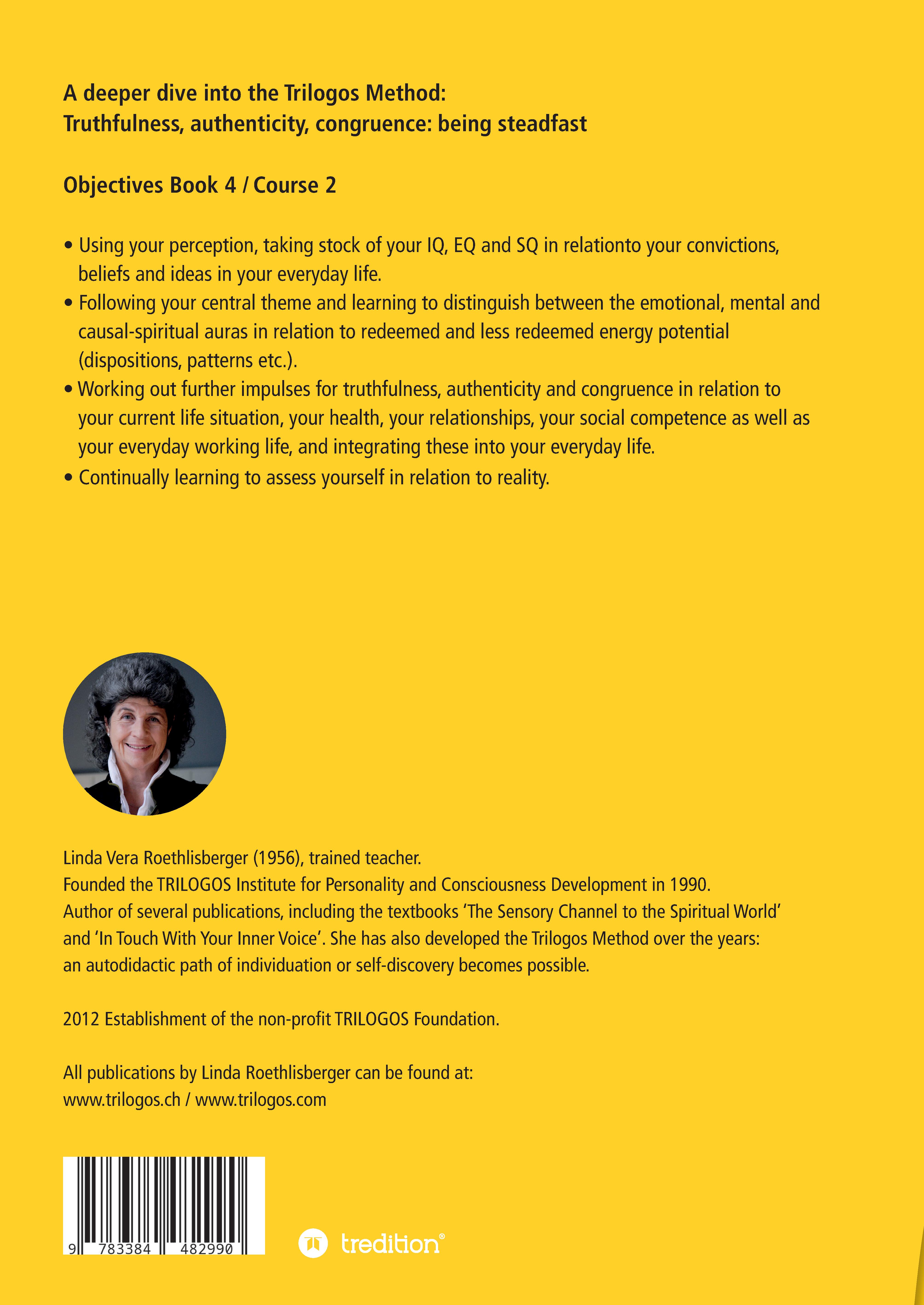 Linda Vera Roethlisberger (1956), ausgebildete Lehrerin Parallel dazu bildete sie in Bern und Paris ihr Talent als Künstlerin aus. Ihre eigenen medialen Anlagen bildete sie weiter als Schülerin von Silvia Wallimann, Prof. Dr. Milan Ryzl und Gordon Higginson und arbeitet seither u.a. auch als Medium. 1990 Gründung vom Institut TRILOGOS für Persönlichkeits- und Bewusstseinsschulung. Autorin mehrerer Publikationen, so u.a. der Lehrbücher »Der sinnliche Draht zur geistigen Welt« und »Im Kontakt mit der inneren Stimme«. Weiter entwickelte sie über die Jahre hinweg die TRILOGOS®Methode: ein autodidaktischer Individuations- oder Selbstfindungsweg wird möglich. 2012 Gründung der gemeinnützigen TRILOGOS Stiftung. _______________________________________________________________________________ Linda Vera Roethlisberger (1956), certified teacher At the same time, she developed her artistic talent in Bern and Paris. She developed and cultivated her own mediumistic capabilities as a student of Silvia Wallimann, Prof. Dr. Milan Ryzl and Gordon Higginson, and has since also been working as a medium. 1990 — Founding of TRILOGOS, an institute for personality and consciousness training. Author of numerous publications, among them the guidebooks The Sensory Channel to the Spiritual World (Der sinnliche Draht zur geistigen Welt) and In Touch With Your Inner Voice (Im Kontakt mit der inneren Stimme). Over the years, she has also developed the Trilogos Method, allowing for self-guided individuation or self-discovery. 2012 — Founding of the charitable Trilogos Foundation
