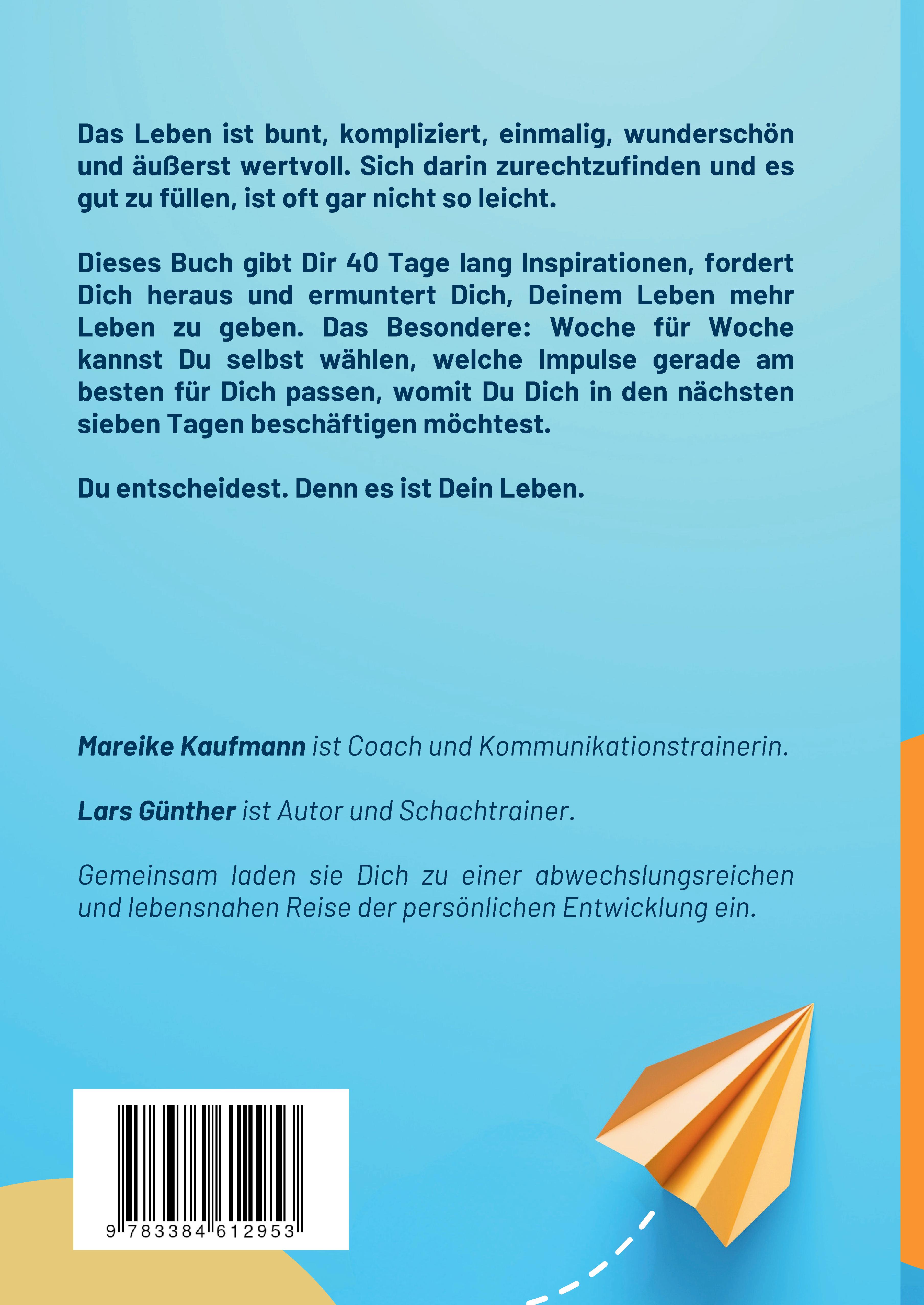 "Leben ... und zwar Deins" gibt Dir 40 Tage lang Inspirationen zur persönlichen Entwicklung - Impulse, dein Leben lebendiger zu gestalten. Das Besondere: Woche für Woche kannst Du selbst wählen, womit es für Dich in den nächsten sieben Tagen weitergeht. Dabei stehen so vielfältige Themen zur Auswahl wie Entwicklung, Dankbarkeit, Gelassenheit, positive Affirmationen, Verantwortung, Liebe, Fülle erleben, Beziehungen gestalten, Glaubenssätze oder gewaltfreie Kommunikation. Du entscheidest - wie im echten Leben!