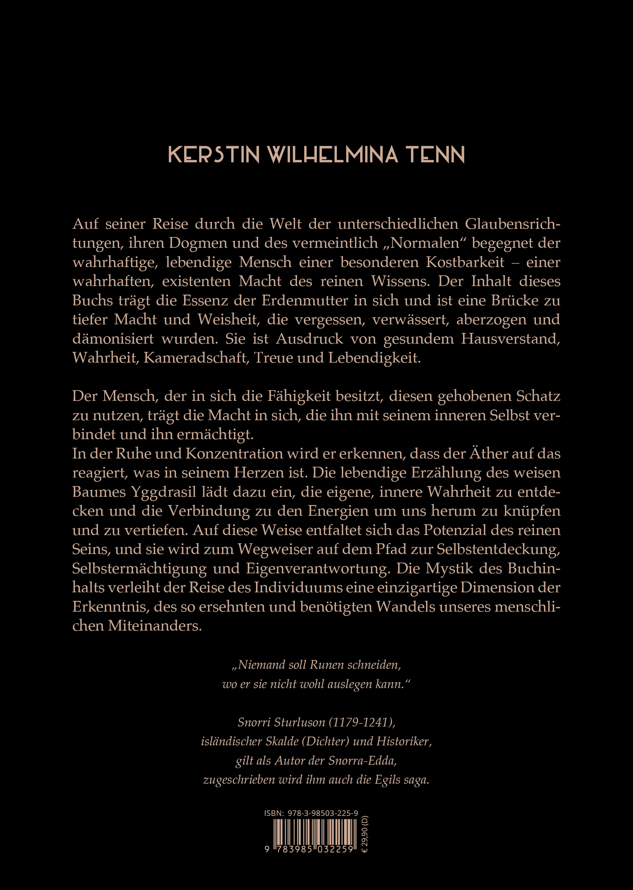 Auf seiner Reise durch die Welt der unterschiedlichen Glaubensrichtungen,zahlreicher Dogmen und des vermeintlich "Normalen" begegnetder lebendige Mensch einer besonderen Kostbarkeit - einer wahrhaften,existenten Macht des reinen Wissens. Der Inhalt dieses Buchs trägt dieEssenz der Erdenmutter in sich und ist eine Brücke zu tiefer Macht undWeisheit, die vergessen, verwässert, aberzogen und dämonisiert wurden.Sie ist Ausdruck von gesundem Hausverstand, Wahrheit, Kameradschaft,Treue und Lebendigkeit.Der Mensch, der in sich die Fähigkeit besitzt, diesen gehobenen Schatzzu nutzen, trägt die Macht in sich, die ihn mit seinem inneren Selbst verbindetund ihn ermächtigt.In der Ruhe und Konzentration wird er erkennen, dass der Äther auf dasreagiert, was in seinem Herzen ist. Die lebendige Erzählung des weisenBaumes Yggdrasil lädt dazu ein, die eigene, innere Wahrheit zu entdeckenund die Verbindung zu den Energien um uns herum zu knüpfenund zu vertiefen. Auf diese Weise entfaltet sich das Potenzial des reinenSeins, und sie wird zum Wegweiser auf dem Pfad zur Selbstentdeckung,Selbstermächtigung und Eigenverantwortung. Die Mystik des Buchinhaltsverleiht der Reise des Individuums eine einzigartige Dimension derErkenntnis, des so ersehnten und benötigten Wandels unseres menschlichenMiteinanders.