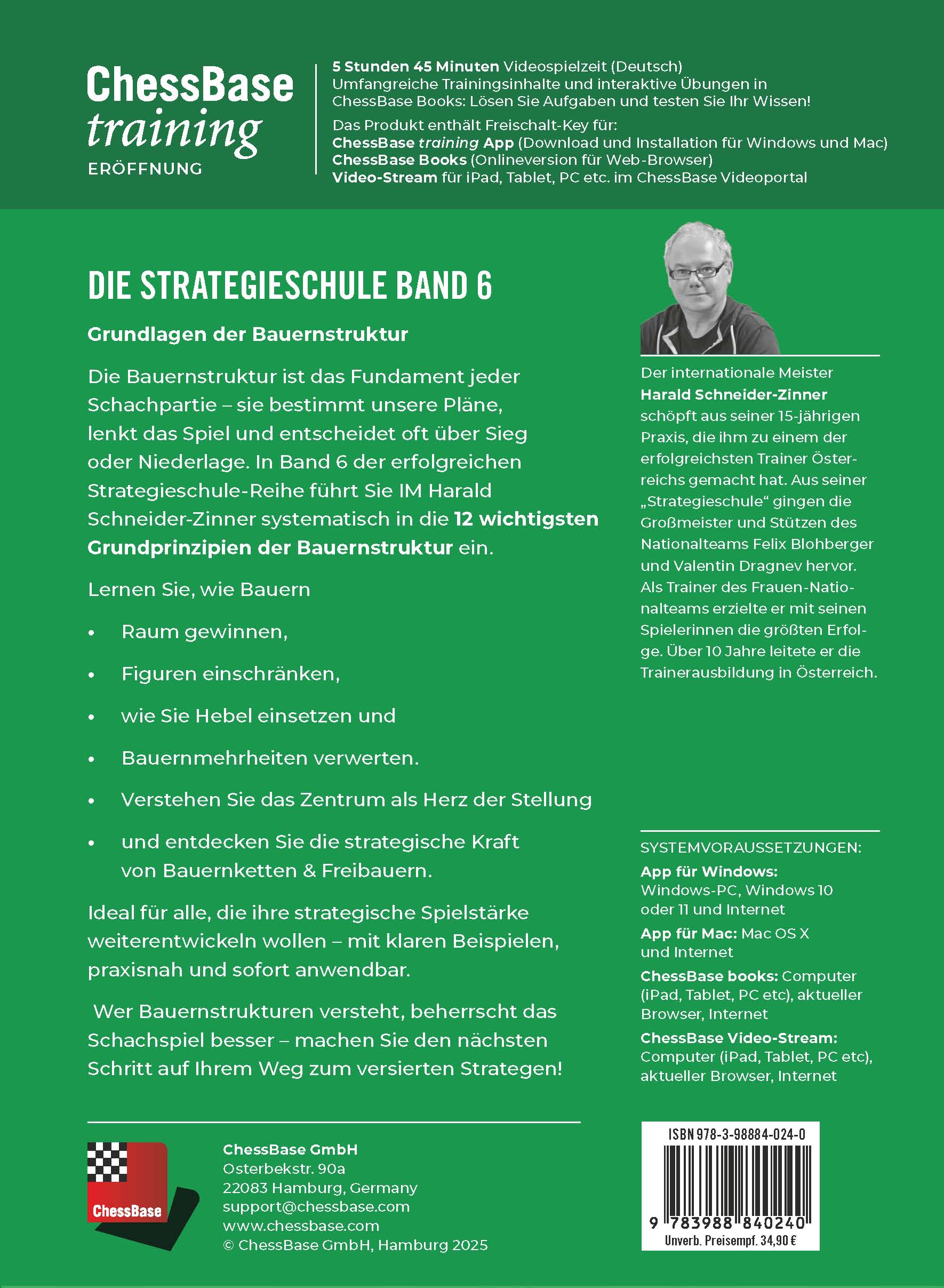 Die Bauernstruktur ist das Fundament jeder Schachpartie - sie bestimmt unsere Pläne, lenkt das Spiel und entscheidet oft über Sieg oder Niederlage. In Band 6 der erfolgreichen Strategieschule-Reihe führt Sie IM Harald Schneider-Zinner systematisch in die 12 wichtigsten Grundprinzipien der Bauernstruktur ein.Lernen Sie, wie Bauern- Raum gewinnen,- Figuren einschränken,- wie Sie Hebel einsetzen und- Bauernmehrheiten verwerten.- Verstehen Sie das Zentrum als Herz der Stellung- und entdecken Sie die strategische Kraft von Bauernketten & Freibauern.Ideal für alle, die ihre strategische Spielstärke weiterentwickeln wollen - mit klaren Beispielen, praxisnah und sofort anwendbar. Wer Bauernstrukturen versteht, beherrscht das Schachspiel besser - machen Sie den nächsten Schritt auf Ihrem Weg zum versierten Strategen!Videospielzeit: 5 Std. 45 min (Deutsch)Sie können alle Partien und Varianten aus den Videoclips in Ihrer ChessBase-Datenbank speichern!SYSTEMVORAUSSETZUNGEN:App für Windows: Windows-PC, Windows 10 oder 11 und InternetApp für Mac: Mac OS X und InternetChessBase books: Computer (iPad, Tablet, PC etc), aktueller Browser, InternetChessBase Video-Stream: Computer (iPad, Tablet, PC etc), aktueller Browser, InternetDieses Produkt enhält KEINE DVD-ROM sondern einen Freischaltcode für Download und Installation.