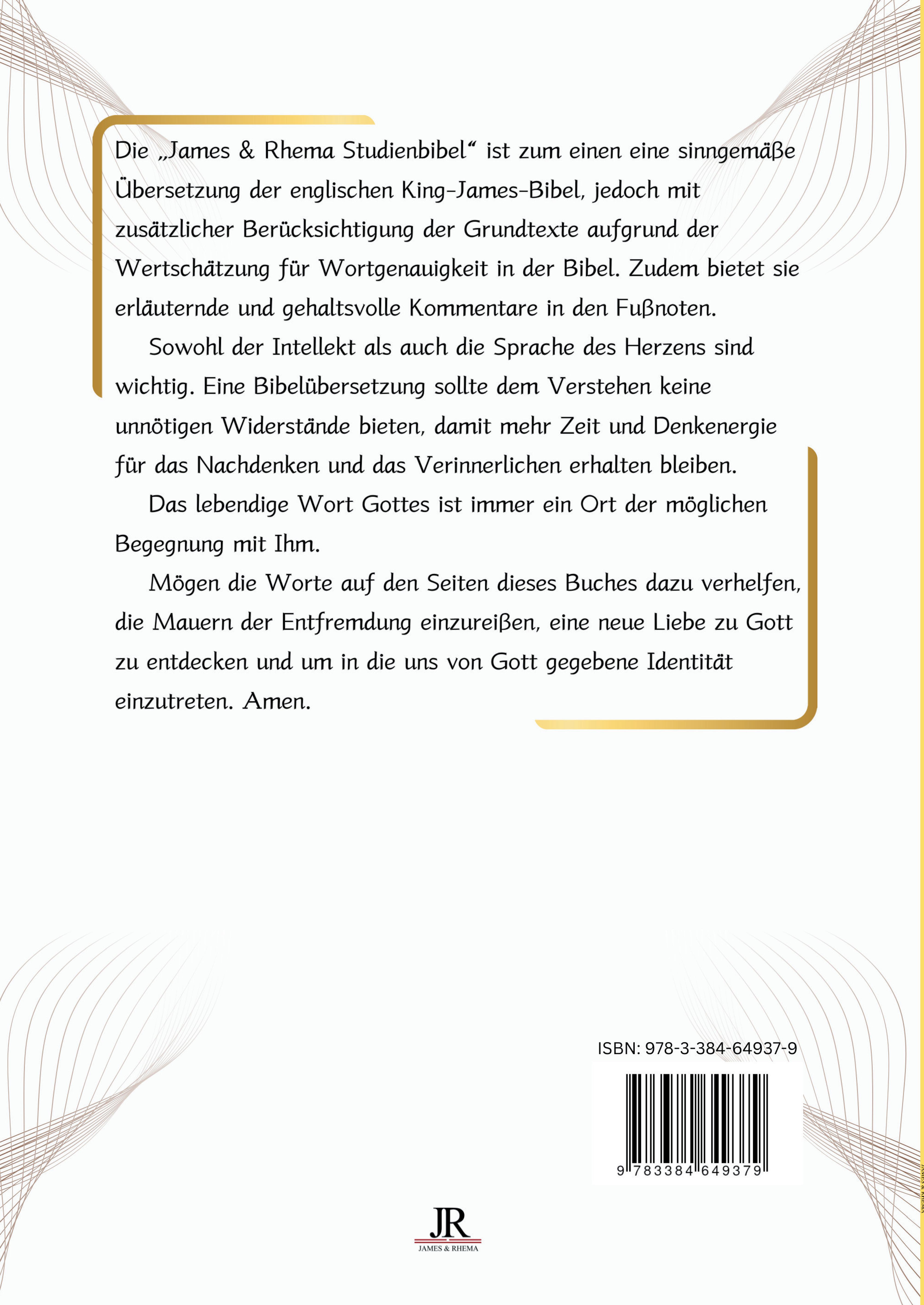 Die "James & Rhema Studienbibel" ist zum einen eine sinngemäße Übersetzung der englischen King-James-Bibel, jedoch mit zusätzlicher Berücksichtigung der Grundtexte aufgrund der Wertschätzung für Wortgenauigkeit in der Bibel. Zudem bietet sie erläuternde und gehaltsvolle Kommentare in den Fußnoten. Sowohl der Intellekt als auch die Sprache des Herzens sind wichtig. Eine Bibelübersetzung sollte dem Verstehen keine unnötigen Widerstände bieten, damit mehr Zeit und Denkenergie für das Nachdenken und das Verinnerlichen erhalten bleiben. Das lebendige Wort Gottes ist immer ein Ort der möglichen Begegnung mit Ihm. Mögen die Worte auf den Seiten dieses Buches dazu verhelfen, die Mauern der Entfremdung einzureißen, eine neue Liebe zu Gott zu entdecken und um in die uns von Gott gegebene Identität einzutreten. Amen.Die James & Rhema soll eine Übersetzung der gesamten Bibel sein. Um keine Neuerscheinungen zu verpassen, gibt es die Möglichkeit der Benachrichtigung unter: https://newsletter.james-rhema.de.