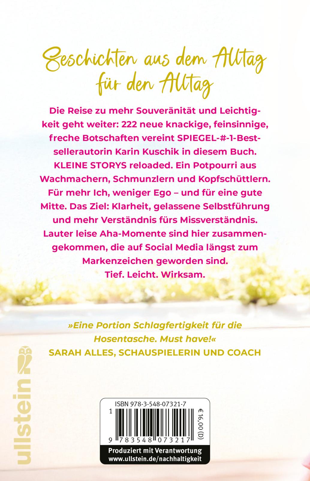 Die Reise zu mehr Souveränität und Leichtigkeit geht weiter: 222 neue knackige, feinsinnige, freche Botschaften vereint SPIEGEL-#-1-Bestsellerautorin Karin Kuschik in diesem Buch. KLEINE STORYS reloaded. Ein Potpourri aus Wachmachern, Schmunzlern und Kopfschüttlern. Für mehr Ich, weniger Ego - und für eine gute Mitte. Das Ziel: Klarheit, gelassene Selbstführung und mehr Verständnis fürs Missverständnis. Lauter leise Aha-Momente sind hier zusammengekommen, die auf Social Media längst zum Markenzeichen geworden sind. Tief. Leicht. Wirksam.