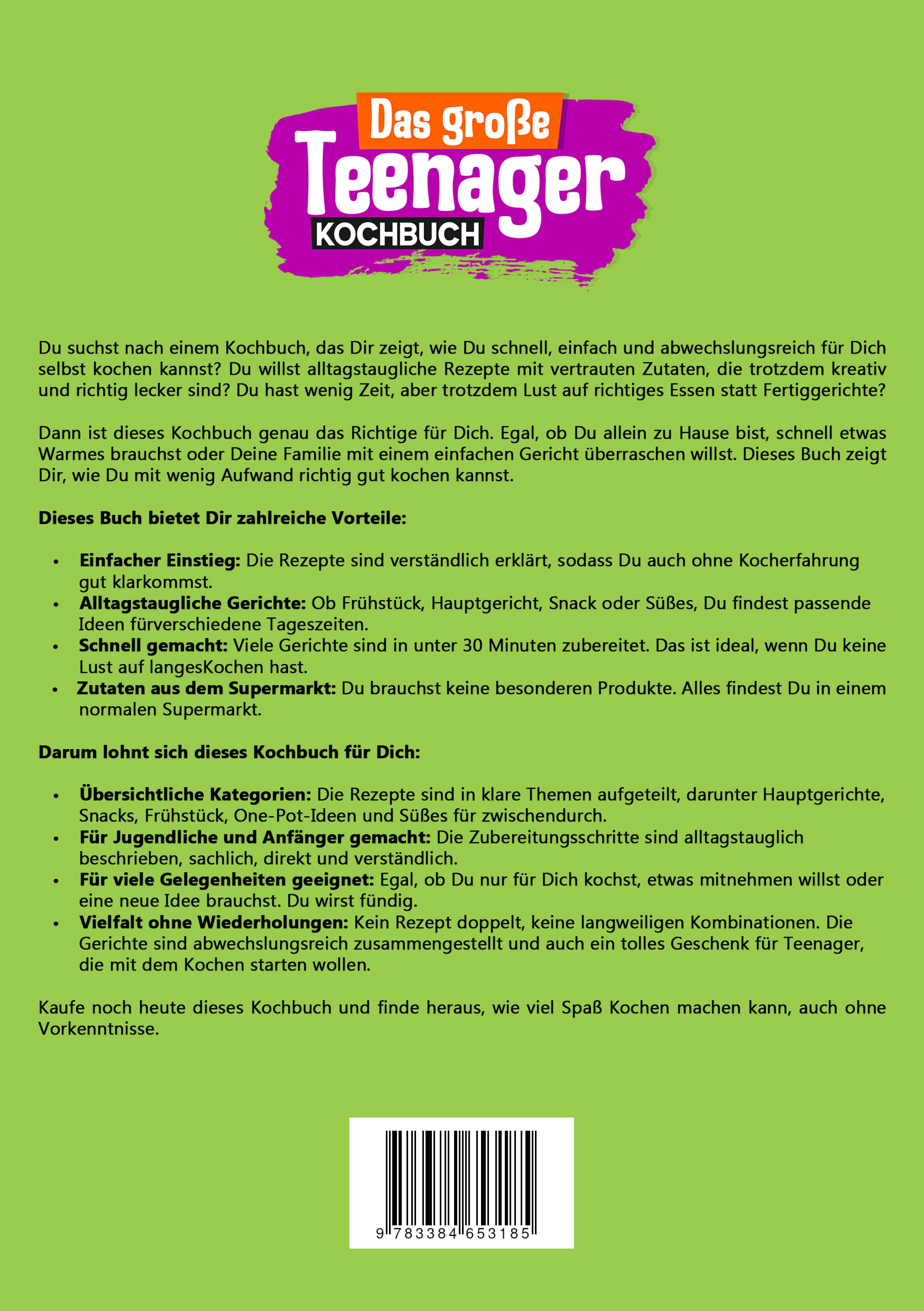 Du suchst nach einem Kochbuch, das Dir zeigt, wie Du schnell, einfach und abwechslungsreich für Dich selbst kochen kannst? Du willst alltagstaugliche Rezepte mit vertrauten Zutaten, die trotzdem kreativ und richtig lecker sind? Du hast wenig Zeit, aber trotzdem Lust auf richtiges Essen statt Fertiggerichte?Dann ist dieses Kochbuch genau das Richtige für Dich. Egal, ob Du allein zu Hause bist, schnell etwas Warmes brauchst oder Deine Familie mit einem einfachen Gericht überraschen willst. Dieses Buch zeigt Dir, wie Du mit wenig Aufwand richtig gut kochen kannst.Dieses Buch bietet Dir zahlreiche Vorteile:- Einfacher Einstieg: Die Rezepte sind verständlich erklärt, sodass Du auch ohne Kocherfahrung gut klarkommst.- Alltagstaugliche Gerichte: Ob Frühstück, Hauptgericht, Snack oder Süßes, Du findest passende Ideen für verschiedene Tageszeiten.- Schnell gemacht: Viele Gerichte sind in unter 30 Minuten zubereitet. Das ist ideal, wenn Du keine Lust auf langes Kochen hast.- Zutaten aus dem Supermarkt: Du brauchst keine besonderen Produkte. Alles findest Du in einem normalen Supermarkt.Darum lohnt sich dieses Kochbuch für Dich:- Übersichtliche Kategorien: Die Rezepte sind in klare Themen aufgeteilt, darunter Hauptgerichte, Snacks, Frühstück, One-Pot-Ideen und Süßes für zwischendurch.- Für Jugendliche und Anfänger gemacht: Die Zubereitungsschritte sind alltagstauglich beschrieben, sachlich, direkt und verständlich.- Für viele Gelegenheiten geeignet: Egal, ob Du nur für Dich kochst, etwas mitnehmen willst oder eine neue Idee brauchst. Du wirst fündig.- Vielfalt ohne Wiederholungen: Kein Rezept doppelt, keine langweiligen Kombinationen. Die Gerichte sind abwechslungsreich zusammengestellt und auch ein tolles Geschenk für Teenager, die mit dem Kochen starten wollen.Kaufe noch heute dieses Kochbuch und finde heraus, wie viel Spaß Kochen machen kann, auch ohne Vorkenntnisse.