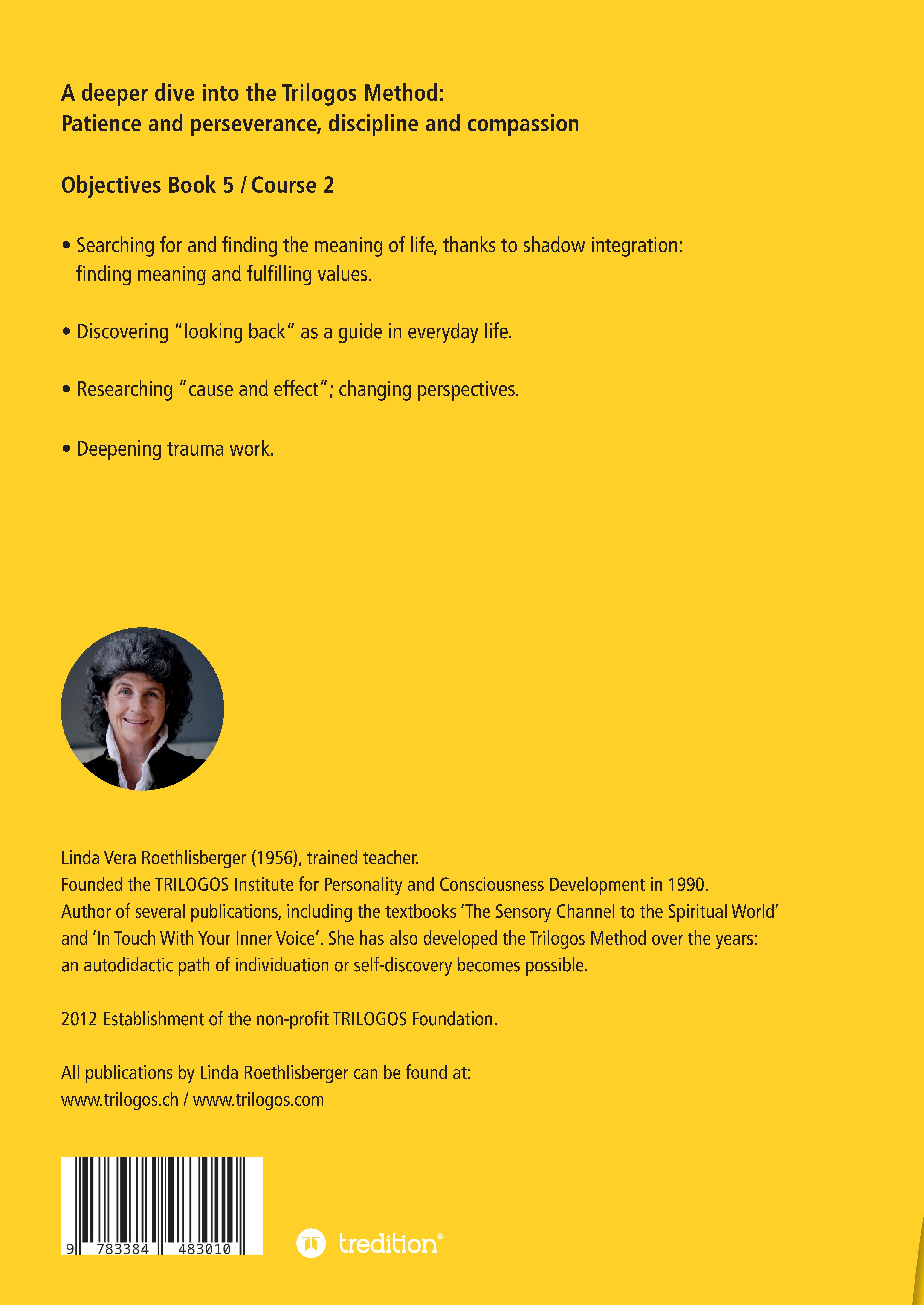 Linda Vera Roethlisberger (1956), ausgebildete Lehrerin Parallel dazu bildete sie in Bern und Paris ihr Talent als Künstlerin aus. Ihre eigenen medialen Anlagen bildete sie weiter als Schülerin von Silvia Wallimann, Prof. Dr. Milan Ryzl und Gordon Higginson und arbeitet seither u.a. auch als Medium. 1990 Gründung vom Institut TRILOGOS für Persönlichkeits- und Bewusstseinsschulung. Autorin mehrerer Publikationen, so u.a. der Lehrbücher »Der sinnliche Draht zur geistigen Welt« und »Im Kontakt mit der inneren Stimme«. Weiter entwickelte sie über die Jahre hinweg die TRILOGOS®Methode: ein autodidaktischer Individuations- oder Selbstfindungsweg wird möglich. 2012 Gründung der gemeinnützigen TRILOGOS Stiftung. _______________________________________________________________________________ Linda Vera Roethlisberger (1956), certified teacher At the same time, she developed her artistic talent in Bern and Paris. She developed and cultivated her own mediumistic capabilities as a student of Silvia Wallimann, Prof. Dr. Milan Ryzl and Gordon Higginson, and has since also been working as a medium. 1990 — Founding of TRILOGOS, an institute for personality and consciousness training. Author of numerous publications, among them the guidebooks The Sensory Channel to the Spiritual World (Der sinnliche Draht zur geistigen Welt) and In Touch With Your Inner Voice (Im Kontakt mit der inneren Stimme). Over the years, she has also developed the Trilogos Method, allowing for self-guided individuation or self-discovery. 2012 — Founding of the charitable Trilogos Foundation