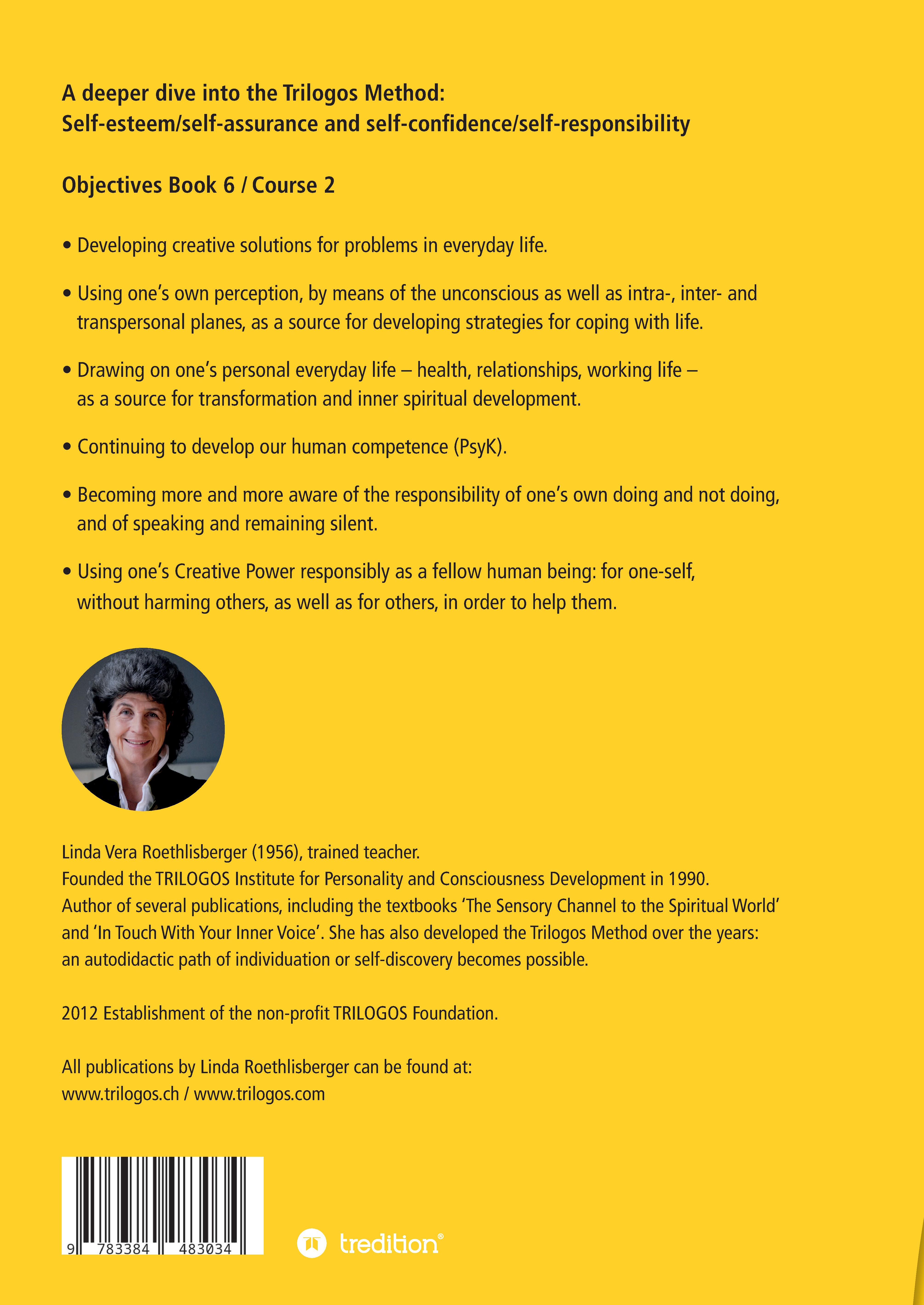 Linda Vera Roethlisberger (1956), ausgebildete Lehrerin Parallel dazu bildete sie in Bern und Paris ihr Talent als Künstlerin aus. Ihre eigenen medialen Anlagen bildete sie weiter als Schülerin von Silvia Wallimann, Prof. Dr. Milan Ryzl und Gordon Higginson und arbeitet seither u.a. auch als Medium. 1990 Gründung vom Institut TRILOGOS für Persönlichkeits- und Bewusstseinsschulung. Autorin mehrerer Publikationen, so u.a. der Lehrbücher »Der sinnliche Draht zur geistigen Welt« und »Im Kontakt mit der inneren Stimme«. Weiter entwickelte sie über die Jahre hinweg die TRILOGOS®Methode: ein autodidaktischer Individuations- oder Selbstfindungsweg wird möglich. 2012 Gründung der gemeinnützigen TRILOGOS Stiftung. _______________________________________________________________________________ Linda Vera Roethlisberger (1956), certified teacher At the same time, she developed her artistic talent in Bern and Paris. She developed and cultivated her own mediumistic capabilities as a student of Silvia Wallimann, Prof. Dr. Milan Ryzl and Gordon Higginson, and has since also been working as a medium. 1990 — Founding of TRILOGOS, an institute for personality and consciousness training. Author of numerous publications, among them the guidebooks The Sensory Channel to the Spiritual World (Der sinnliche Draht zur geistigen Welt) and In Touch With Your Inner Voice (Im Kontakt mit der inneren Stimme). Over the years, she has also developed the Trilogos Method, allowing for self-guided individuation or self-discovery. 2012 — Founding of the charitable Trilogos Foundation