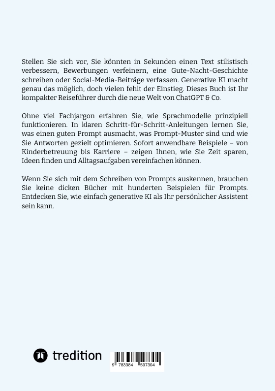 | Schlagworte | Bewerbungen • Bürokommunikation • generative KI • Hausaufgabenhilfe • Promptbeispiele • Prompt Engineering • Prompting • Selbsthilfe • SEO-Optimierung • Textanalyse |