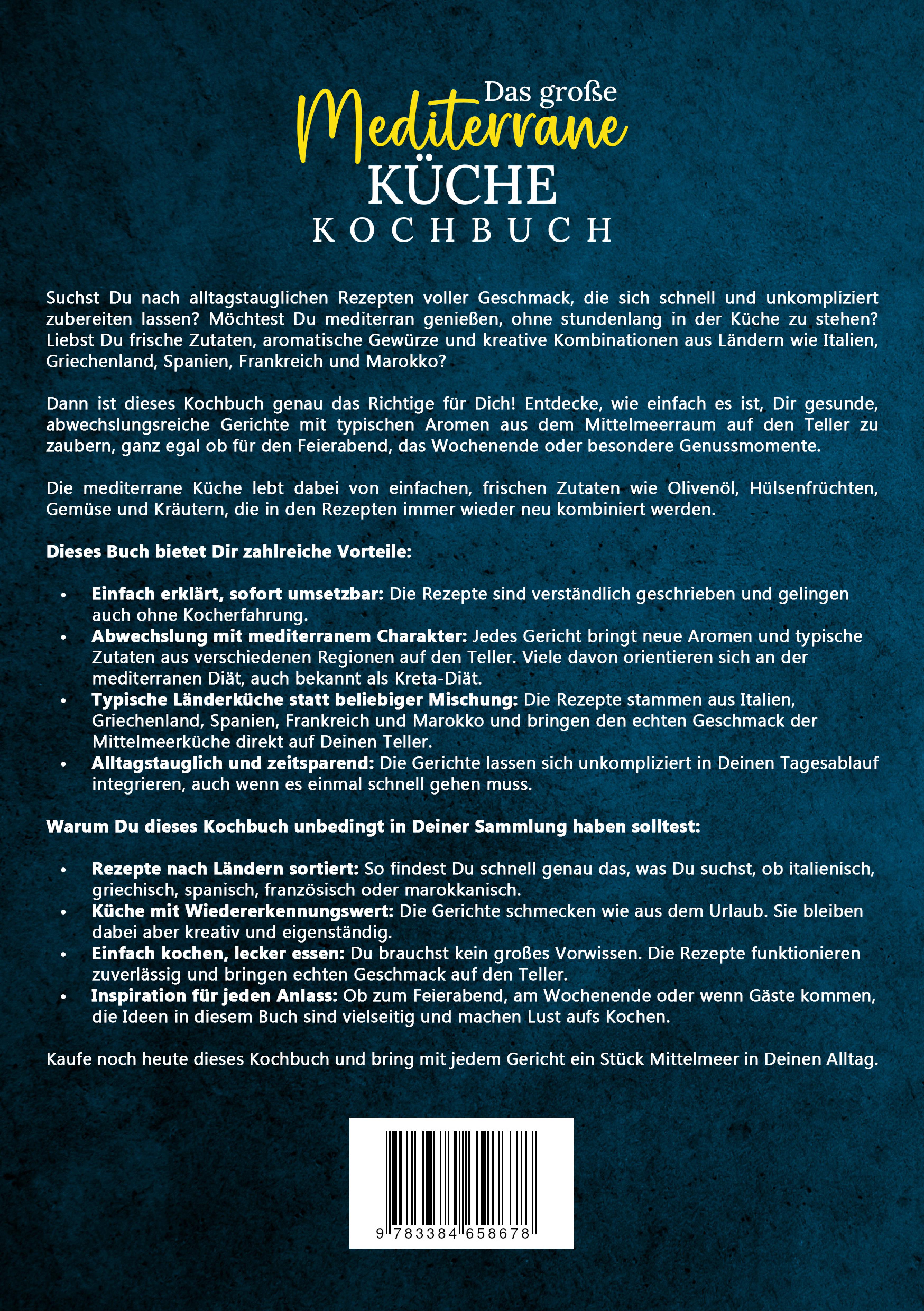 Suchst Du nach alltagstauglichen Rezepten voller Geschmack, die sich schnell und unkompliziert zubereiten lassen? Möchtest Du mediterran genießen, ohne stundenlang in der Küche zu stehen? Liebst Du frische Zutaten, aromatische Gewürze und kreative Kombinationen aus Ländern wie Italien, Griechenland, Spanien, Frankreich und Marokko?Dann ist dieses Kochbuch genau das Richtige für Dich! Entdecke, wie einfach es ist, Dir gesunde, abwechslungsreiche Gerichte mit typischen Aromen aus dem Mittelmeerraum auf den Teller zu zaubern, ganz egal ob für den Feierabend, das Wochenende oder besondere Genussmomente.Die mediterrane Küche lebt dabei von einfachen, frischen Zutaten wie Olivenöl, Hülsenfrüchten, Gemüse und Kräutern, die in den Rezepten immer wieder neu kombiniert werden.Dieses Buch bietet Dir zahlreiche Vorteile:- Einfach erklärt, sofort umsetzbar: Die Rezepte sind verständlich geschrieben und gelingen auch ohne Kocherfahrung.- Abwechslung mit mediterranem Charakter: Jedes Gericht bringt neue Aromen und typische Zutaten aus verschiedenen Regionen auf den Teller. Viele davon orientieren sich an der mediterranen Diät, auch bekannt als Kreta-Diät.- Typische Länderküche statt beliebiger Mischung: Die Rezepte stammen aus Italien, Griechenland, Spanien, Frankreich und Marokko und bringen den echten Geschmack der Mittelmeerküche direkt auf Deinen Teller.- Alltagstauglich und zeitsparend: Die Gerichte lassen sich unkompliziert in Deinen Tagesablauf integrieren, auch wenn es einmal schnell gehen muss.Warum Du dieses Kochbuch unbedingt in Deiner Sammlung haben solltest:- Rezepte nach Ländern sortiert: So findest Du schnell genau das, was Du suchst, ob italienisch, griechisch, spanisch, französisch oder marokkanisch.- Küche mit Wiedererkennungswert: Die Gerichte schmecken wie aus dem Urlaub. Sie bleiben dabei aber kreativ und eigenständig.- Einfach kochen, lecker essen: Du brauchst kein großes Vorwissen. Die Rezepte funktionieren zuverlässig und bringen echten Geschmack auf den Teller.- Inspiration für jeden Anlass: Ob zum Feierabend, am Wochenende oder wenn Gäste kommen, die Ideen in diesem Buch sind vielseitig und machen Lust aufs Kochen.Kaufe noch heute dieses Kochbuch und bring mit jedem Gericht ein Stück Mittelmeer in Deinen Alltag.