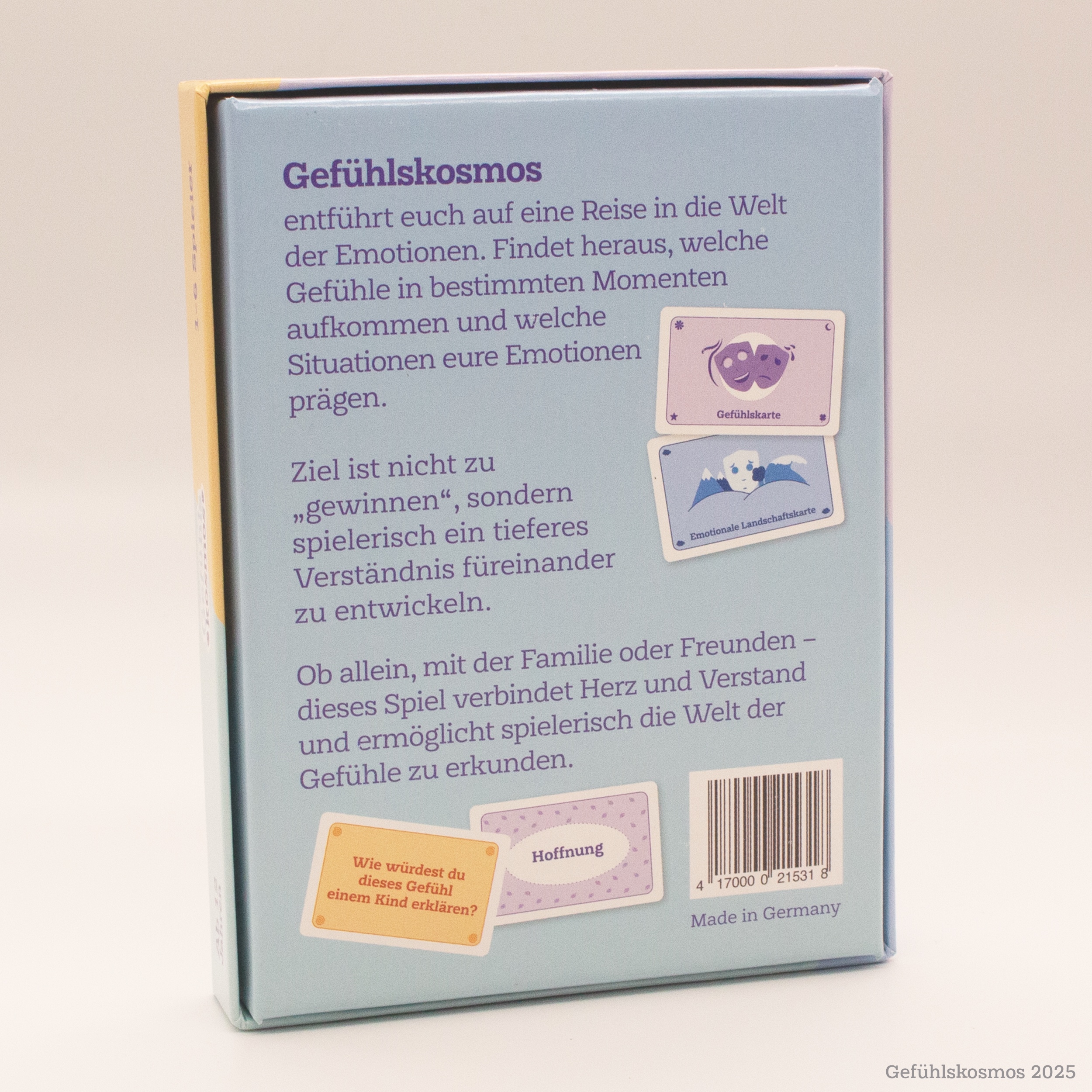 Erlebt gemeinsam mit Familie oder Freunden, wie leicht es sein kann, über Gefühle zu sprechen. Mit 55 liebevoll gestalteten Karten entdeckt Ihr, welche Emotionen in bestimmten Momenten aufkommen und entwickelt dadurch wertvolle Soft Skills für Alltag und Beruf.