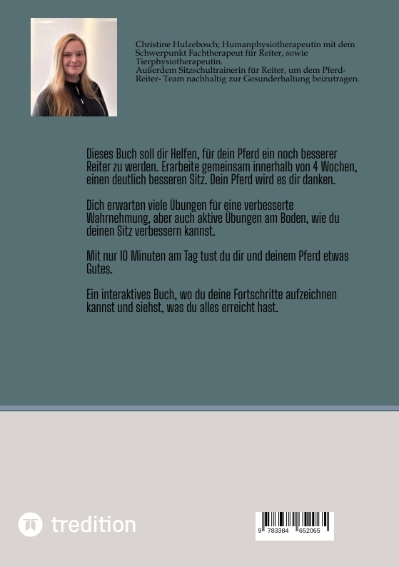 Das Buch ist ein Arbeitsbuch für alle Reiterinnen und Reiter, die sich beim Reiten verbessern wollen. In diesem Buch geht es um Übungen zur Wahrnehmung und zum aktiven Verbessern des Sitzes auf dem Pferd. Es sind tägliche Übungen beschrieben, welche zur Verbesserung des Sitzes durchgeführt werden. Ebenso ist es möglich, diese Fortschritte im Buch festzuhalten.