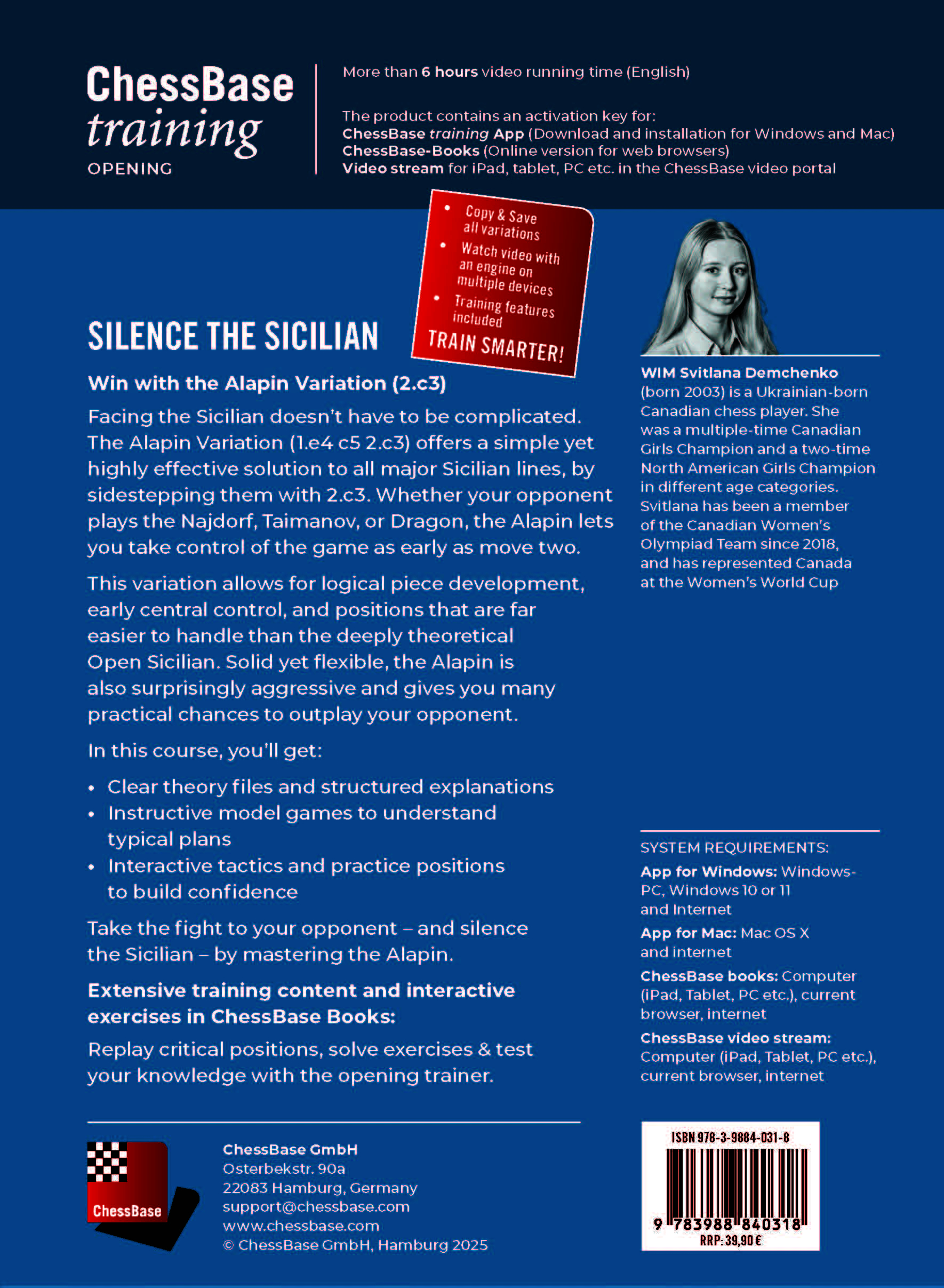 SILENCE THE SICILIANWin with the Alapin Variation (2.c3)Facing the Sicilian doesn't have to be complicated. The Alapin Variation (1.e4 c5 2.c3) offers a simple yet highly effective solution to all major Sicilian lines, by sidestepping them with 2.c3. Whether your opponent plays the Najdorf, Taimanov, or Dragon, the Alapin lets you take control of the game as early as move two.This variation allows for logical piece development, early central control, and positions that are far easier to handle than the deeply theoretical Open Sicilian. Solid yet flexible, the Alapin is also surprisingly aggressive and gives you many practical chances to outplay your opponent.In this course, you'll get:- Clear theory files and structured explanations- Instructive model games to understand typical plans- Interactive tactics and practice positions to build confidenceTake the fight to your opponent - and silence the Sicilian - by mastering the Alapin.Extensive training content and interactive exercises in ChessBase Books: Replay critical positions, solve exercises & test your knowledge with the opening trainer.More than 6 hours video running time (English)The product contains an activation key for: ChessBase training App (Download and installation for Windows and Mac)ChessBase-Books (Online version for web browsers)Video stream for iPad, tablet, PC etc. in the ChessBase video portalTRAIN SMARTER!- Copy & Save all variations- Watch video with an engine on multiple devices- Training features includedSYSTEM REQUIREMENTS: App for Windows: Windows- PC, Windows 10 or 11 and Internet App for Mac: Mac OS X and internetChessBase books: Computer (iPad, Tablet, PC etc.), current browser, internet ChessBase video stream: Computer (iPad, Tablet, PC etc.), current browser, internetDieses Produkt beinhaltet KEINE DVD-ROM sondern einen Freischaltcode für Download und Installation!