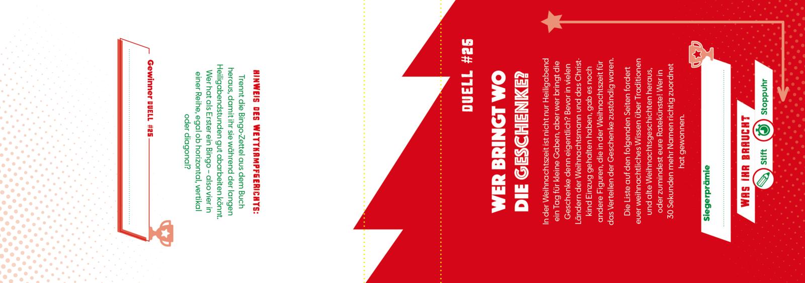 Dieses Duell-Buch bringt ordentlich Action in die Weihnachtszeit! Schluss mit langweiligen Abenden und immer gleichen Feiertagen: Hier warten 40 originelle Spiele, knifflige Rätsel und kreative Challenges darauf, von euch gemeistert zu werden. Ob ihr als Freunde, Geschwister, Eltern-Kind-Gespann oder als Paar gegeneinander antretet - jetzt heißt es: Wer hat das Zeug zum Weihnachts-Champion?