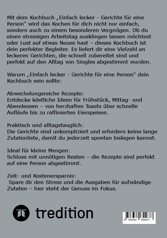 Das Buch "Einfach lecker - Gerichte für eine Person" richtet sich an Menschen, die gerne unkompliziert und schmackhaft kochen möchten, aber nur für sich selbst. Es bietet eine Vielzahl von Rezepten, die speziell auf eine einzelne Person abgestimmt sind, sodass man keine großen Mengen zubereiten muss. Das Buch zeigt, wie man mit einfachen Zutaten und wenig Aufwand leckere Mahlzeiten zaubern kann, die sowohl sättigend als auch abwechslungsreich sind. Es ist ideal für alle, die unabhängig und flexibel essen möchten, ohne auf Geschmack verzichten zu müssen.