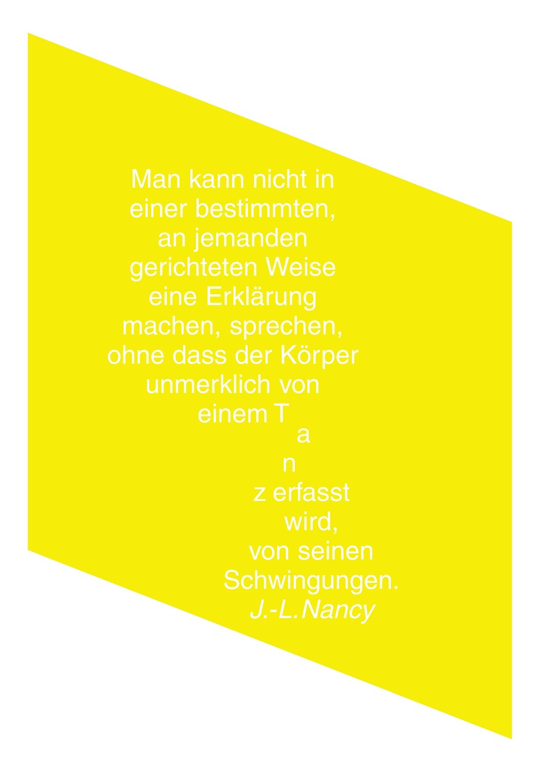 """Ich möchte betonen, dass das, was ich gesagt habe, dass mein Körper nicht mehr einfach nur da ist, sondern er durch seinen Rhythmus einen Raum öffnet, durch seine Modulation des Raumes um ihn herum; ich sage das sehr bewusst um mich an Heidegger heranzutasten und an das Dasein von Heidegger." (Jean-Luc Nancy)Kaum eine andere Kunstgattung hat in den vergangenen Jahren soviel Aufmerksamkeit und Interesse erregt wie der Tanz. Abseits der klassischen oder der stürmisch-expressiven Aufführungen haben sich Choreographen und Tänzer etabliert, die den Kontakt und die Nähe mit der ästhetischen Theorie des 20. / 21. Jahrhunderts suchen. Was denken Philosophen über den Tanz? Welche Gedanken lassen die Choreographen tanzen? Die Sprachen des Körpers werden auf beiden Seiten gehört."Natürlich ist der Tanz auch Zeit, aber es ist eine Zeit, die in jedem Moment auch offen ist wie der Raum. Es ist keine lineare Zeit."(Jean-Luc Nancy)"