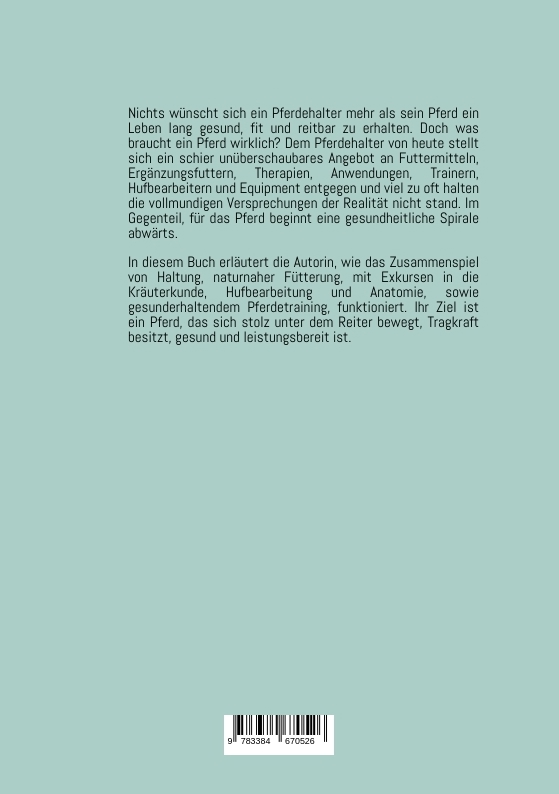 Nichts wünscht sich ein Pferdehalter mehr als sein Pferd ein Leben lang gesund, fit und reitbar zu erhalten. Doch was braucht ein Pferd wirklich? Dem Pferdehalter von heute stellt sich ein schier unüberschaubares Angebot an Futtermitteln, Ergänzungsfuttern, Therapien, Anwendungen, Trainern, Hufbearbeitern und Equipment entgegen und viel zu oft halten die vollmundigen Versprechungen der Realität nicht stand. Im Gegenteil, für das Pferd beginnt eine gesundheitliche Spirale abwärts. In diesem Buch erläutert die Autorin, wie das Zusammenspiel von Haltung, naturnaher Fütterung, mit Exkursen in die Kräuterkunde, Hufbearbeitung und Anatomie, sowie gesunderhaltendem Pferdetraining, funktioniert. Ihr Ziel ist ein Pferd, das sich stolz unter dem Reiter bewegt, Tragkraft besitzt, gesund und leistungsbereit ist.