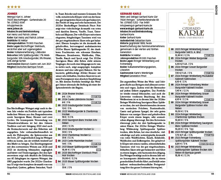 Einer der wichtigsten Begleiter für alle Weininteressierten, die sich über die aktuellen Entwicklungen in der deutschen Weinszene auf dem Laufenden halten möchten. Für die 8. Ausgabe des VINUM Weinguides hat das 30-köpfige Expertenteam um die Chefredakteure Matthias F. Mangold und Harald Scholl im Laufe des Jahres über 10.000 Weine der 1.000 besten Betriebe aus allen deutschen Anbaugebieten bewertet.