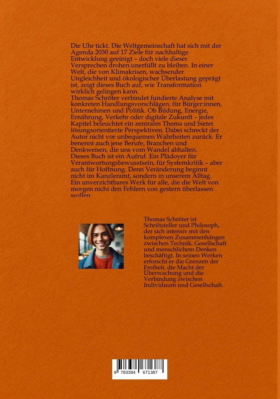Kurzprofil Thomas Schröter ist Schriftsteller, Denker und Grenzgänger zwischen Systemen. In seinem Werk beschäftigt er sich mit der feinen Linie zwischen gesellschaftlicher Ordnung und innerem Aufruhr, mit dem Spannungsfeld zwischen individueller Freiheit und kollektiver Verantwortung. Seine Texte sind gleichermaßen Analyse und Spiegel – sie fordern heraus, berühren und stellen die Wirklichkeit infrage. Biografischer Hintergrund Thomas Schröter wurde 1978 geboren und war zunächst in einem völlig anderen Umfeld tätig: Nach seiner Ausbildung zum Industriekaufmann (1998–2001) war er mehrere Jahre als Produktionsplaner bei einem internationalen Automobilzulieferer beschäftigt. Diese Zeit prägte seinen Blick auf wirtschaftliche Systeme, Effizienzdenken und den oft übersehenen Preis von Produktivität. Mit einem feinen Gespür für Strukturen und Widersprüche entwickelte er sich vom analytisch denkenden Planer zum kritisch schreibenden Beobachter. Was zunächst in Notizen und Fragmenten begann, wurde zur Grundlage eines literarischen Schaffens, das heute ganze Gesellschaftsentwürfe durchdringt. Literarischer Ansatz Thomas Schröters Texte entstehen aus der Reibung zwischen Außenwelt und Innenleben. Sein Schreiben verbindet klare Argumentation mit emotionaler Tiefe. Er greift gesellschaftliche, psychologische und politische Themen auf, stellt sie in neue Zusammenhänge und erzählt sie in menschlich greifbarer Sprache. Dabei legt er besonderen Wert auf: • die Verbindung von Fiktion und Wirklichkeit • realitätsnahe Szenarien, die wie Zukunft klingen, aber im Jetzt verwurzelt sind • eine ethisch-philosophische Perspektive auf Macht, Technik, Natur und Identität Seine Bücher reichen von politischer Fiktion über psychologische Innenansichten bis hin zu sachlich fundierten Erzählformen über gesellschaftliche Entwicklungen, technologische Einflüsse und menschliches Verhalten im Wandel. Stil und Haltung Stilistisch bewegt sich Thomas Schröter zwischen erzählender Klarheit und philosophischer Tiefe. Seine Texte sind strukturiert, zugänglich, aber nie simpel. Er will nicht belehren – er will auslösen. Gedanken. Gefühle. Zweifel. Hoffnung. Sein Schreiben ist inspiriert von einem humanistischen Weltbild, das in der Sprache einen Ort der Aufklärung, aber auch der Heilung erkennt. Es ist nicht das laute Wort, das ihn interessiert – sondern das, das nachhallt.
