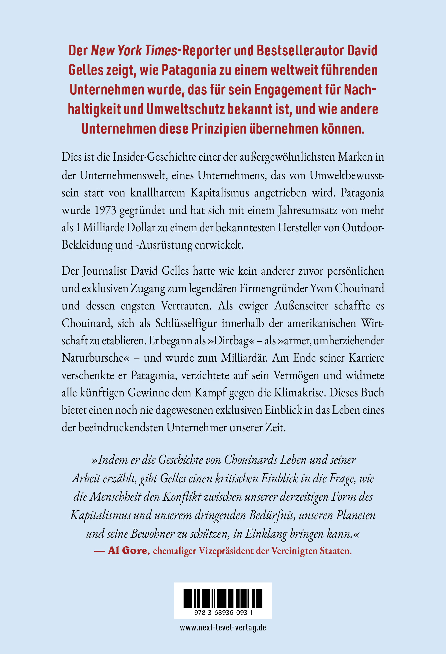 Der Journalist David Gelles hatte wie kein anderer zuvor persönlichen und exklusiven Zugang zum legendären Firmengründer Yvon Chouinard und dessen engsten Vertrauten. Als ewiger Außenseiter schaffte es Chouinard, sich als Schlüsselfigur innerhalb der amerikanischen Wirtschaft zu etablieren.