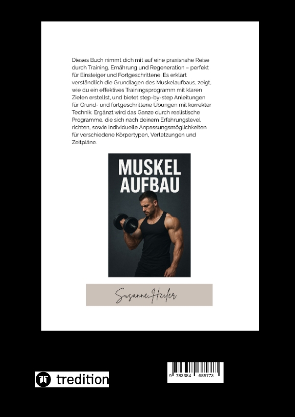 Dieses Buch ist dein ultimativer Begleiter auf dem Weg zu mehr Kraft, Muskelmasse und Fitness. Egal, ob du Anfänger bist oder bereits Erfahrung im Gym hast - hier findest du verständliche Erklärungen, effektive Trainingspläne und wertvolle Tipps, um deine Ziele zu erreichen. Erfahre alles über die richtigen Übungen, Ernährung und Motivation, um dein Training optimal zu gestalten und nachhaltige Erfolge zu erzielen. Mit "Gym und Muskelaufbau" bist du bestens gerüstet, um dein volles Potenzial zu entfalten und deine Fitnessreise erfolgreich zu starten oder weiterzuführen.Dieses Buch nimmt dich mit auf eine praxisnahe Reise durch Training, Ernährung und Regeneration - perfekt für Einsteiger und Fortgeschrittene. Es erklärt verständlich die Grundlagen des Muskelaufbaus, zeigt, wie du ein effektives Trainingsprogramm mit klaren Zielen erstellst, und bietet step-by-step Anleitungen für Grund- und fortgeschrittene Übungen mit korrekter Technik. Ergänzt wird das Ganze durch realistische Programme, die sich nach deinem Erfahrungslevel richten, sowie individuelle Anpassungsmöglichkeiten für verschiedene Körpertypen, Verletzungen und Zeitpläne.