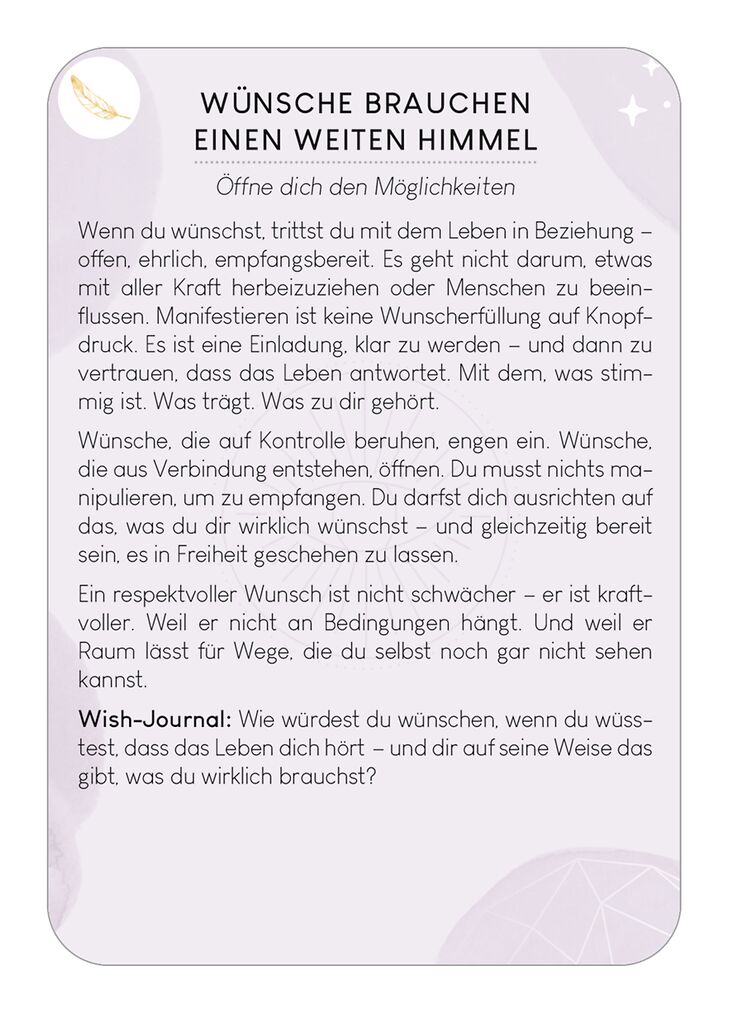 Die 50 Karten in dieser Box erklären spielerisch und Schritt für Schritt, wie Herzenswünsche durch die Kraft der Manifestation wahr werden können: im Alltag, im Job und in der Liebe.
