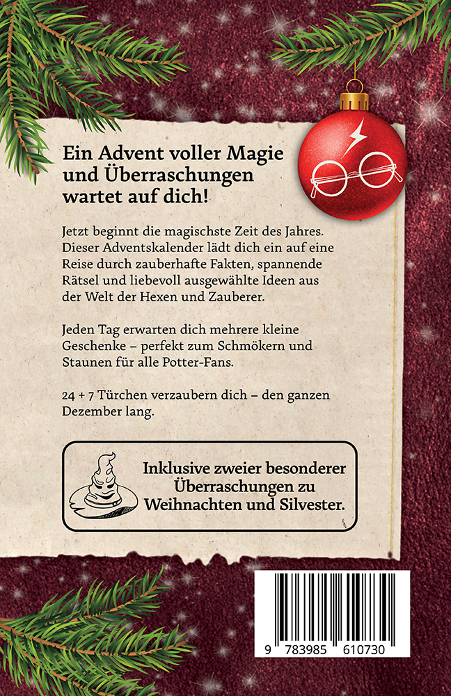 Hinter jedem Türchen steckt eine Überraschung: Ob faszinierende Fakten aus der Zauberwelt, kreative Drink- und Backrezepte oder knifflige Wissensspiele - dieser Adventskalender bringt täglich neuen Zauberspaß für kleine und große Fans.